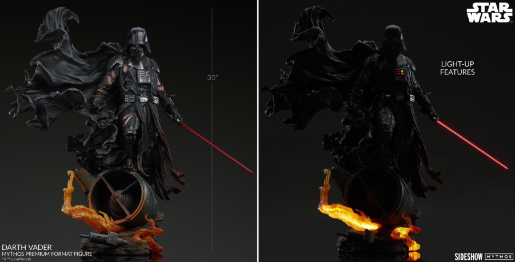 Measuring 30" tall, 28.5" wide, and 15" deep, the Darth Vader Mythos Premium Format Figure depicts Vader standing atop the flaming wreckage of a Rebel X-Wing engine. The menacing Sith Lord is battle-worn but not backing down until he claims victory for the Galactic Empire. With lightsaber drawn and his armor in disarray, the dreaded villain shrugs off enemy fire while channeling his fearsome Force powers.