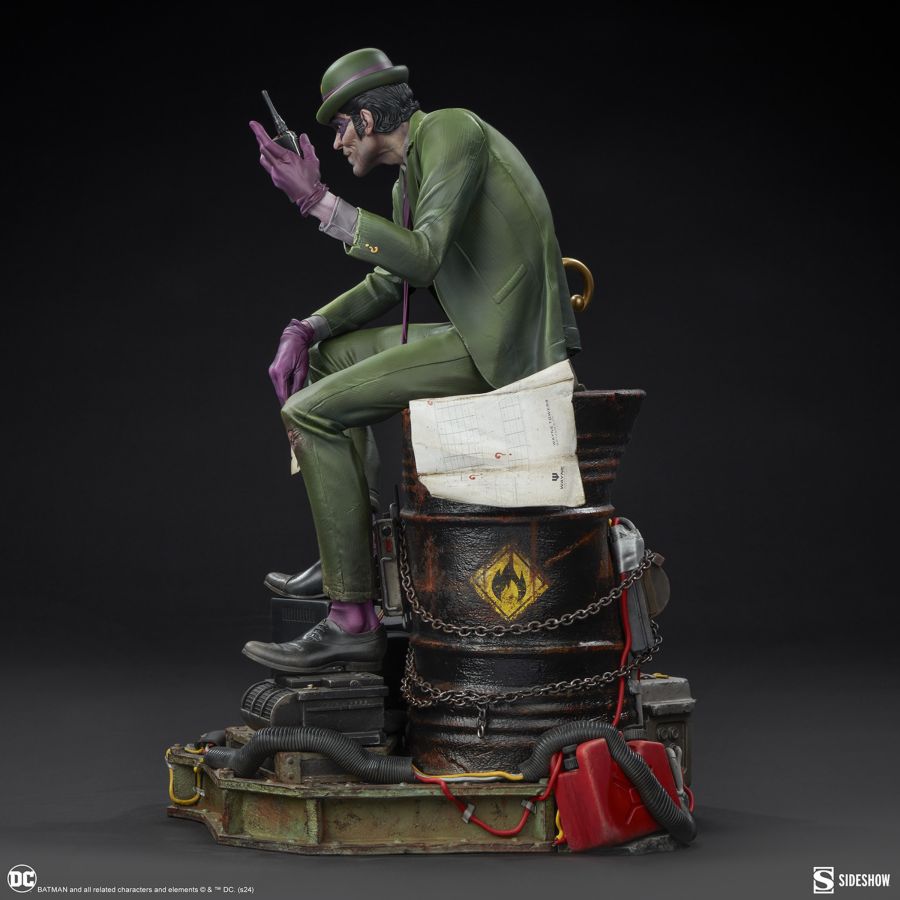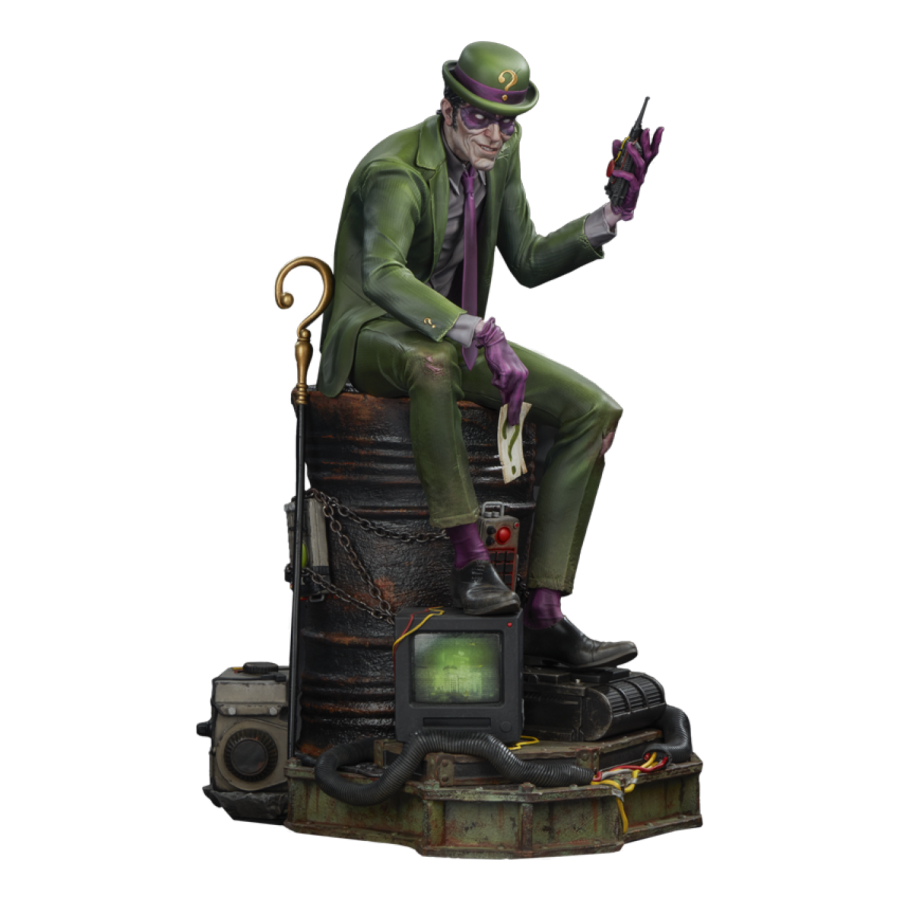 Inspired by the character's comic book appearance, The Riddler Premium Format Figure presents this Gotham City villain at his most cunning and condescending. He wears his classic green suit and bowler hat, a purplish gray undershirt, and a purple tie and mask with matching dress socks and gloves. The DC statue's industrial base is rife with risks aimed to test the so-called World's Greatest Detective. If The Riddler wins, Wayne Tower goes BOOM!