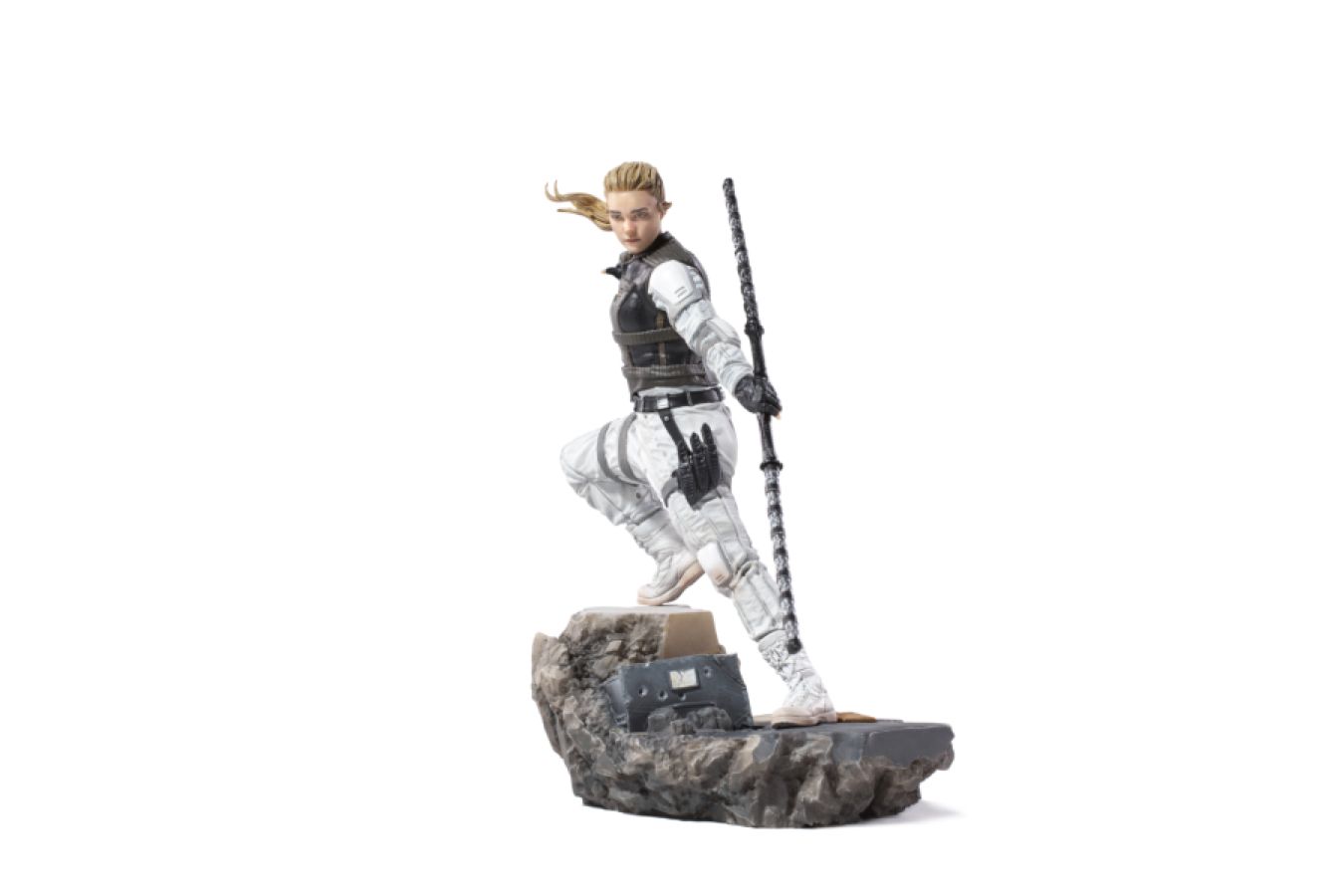 With a body expression full of movement, the figure of the blond Russian agent climbs a diorama base full of debris and elements of a combat scenario. Dressed in a white tactical uniform, with a black vest and gloves, she poses with her long stick in her left hand, as if spinning it, ready to confront an opponent who tries to surprise her in vain. Thus Iron Studios presents the statue "Yelena BDS Art Scale 1/10 - Black Widow - Iron Studios", Natasha Romanoff's ally in the Black Widow movie. In the Marvel comics, Yelena Belova and Natasha Romanoff participated in the same training program for intelligence agents in the so-called Red Room, with Yelena receiving the same training to become as effective a spy as Romanoff. The blonde became the second agent to adopt the code name Black Widow. She is a master in martial arts, sniper, computer expert, and fluent in several languages. In addition to remarkable acrobatic skills, thanks to her high physical and athletic conditioning. The statue faithfully portrays the characteristics of actress Florence Pugh, who plays the spy in the MCU movie Black Widow, which will premiere on July 9 in theaters and on Disney+ streaming. This piece will be part of a series that forms a diorama, with Yelena alongside her allies The Red Guardian and Black Widow against the mercenary Taskmaster, also by Iron Studios. View all