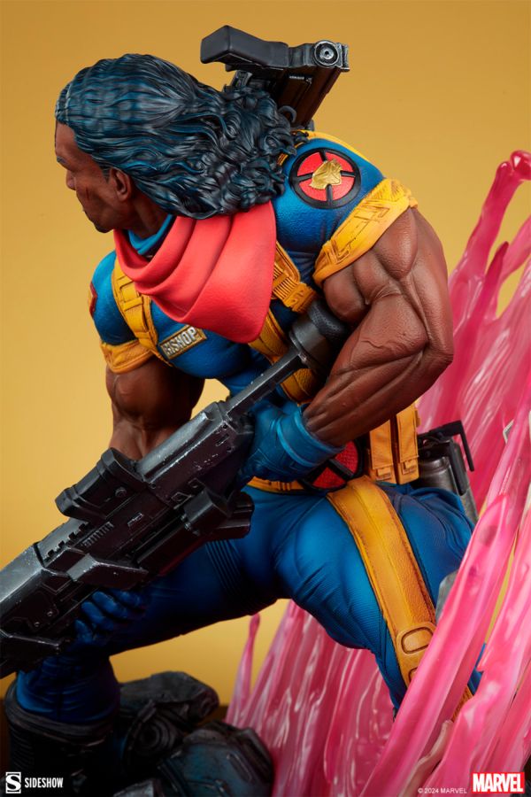"If you plan on leaving, don ’t plan on doing it alive." Sideshow presents the Bishop: Future and Past Premium Format Figure. This extraordinary Marvel collectible showcases the converging missions of a time-traveling mutant hero. Measuring 20" tall, 17.6" wide, and 14.5" deep, the Bishop: Future and Past Premium Format Figure finds Lucas Bishop traversing two different time periods filled with foes. Formerly a police officer, he wields massive dual X.S.E. guns as he moves on to the next fight. In the past, Bishop leaves behind the wreckage of a battle with Trevor Fitzroy in the Danger Room. In the future, Bishop treks across a Sentinel-studded battleground from his own childhood, a place where mutants are hunted and destroyed at any cost. Blazing a path toward a new life, Bishop uses his energy-based powers and a temporal device to take him through a swirling portal, stepping forward in search of hope while one foot remains fixed in the ruins of the X-Mansion. This fully sculpted X-Men collectible depicts Bishop in his '90s-era costume, including a yellow and blue uniform and red bandana tied beneath his long wavy hair. The Marvel statue's base is split into distinct environments, one a decimated training facility and one full of scattered mechanical parts and anti-mutant propaganda posters. A large, circular, pink portal bisects the scene and radiates glowing light across the entire piece as a standout light-up feature in the latest addition to Sideshow's quarter scale Marvel collection. The fight for mutantkind has just begun! View all