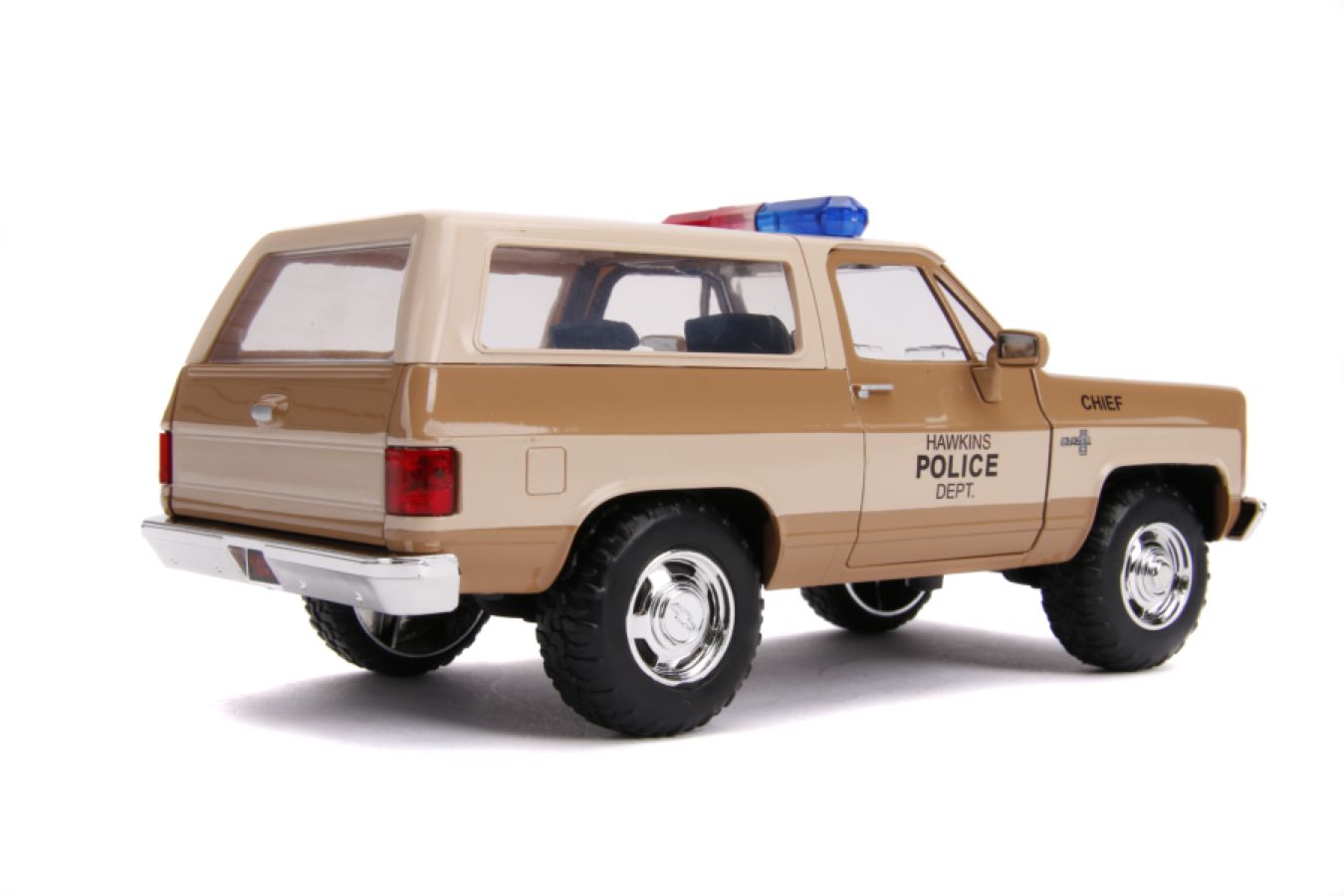 Make your escape from the Upside Down with the Stranger Things 1980 Chevy K5 Blazer. Featuring styling cues directly from Stranger Things, this collectible die-cast replica is sure to be a standout in any Stranger Things collection! Also includes a die-cast collectible Hawkins Police badge. Collect them all!