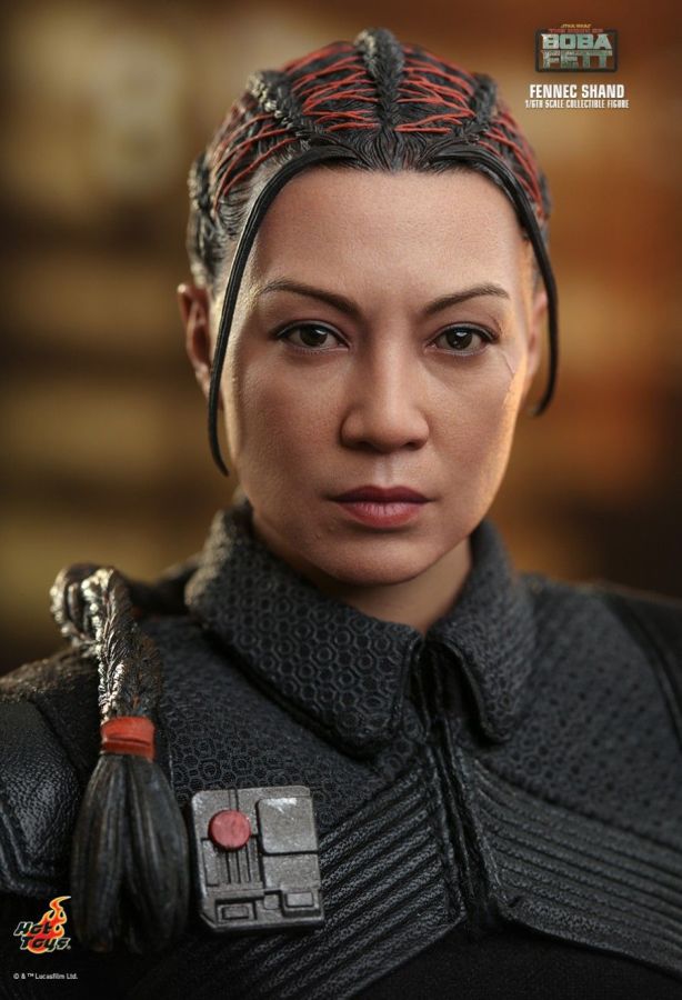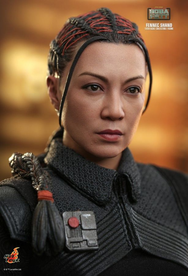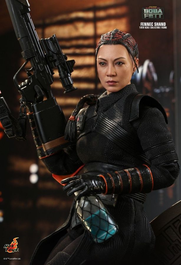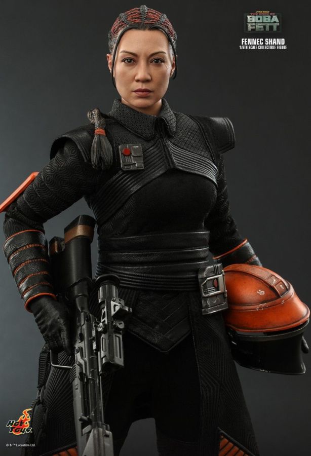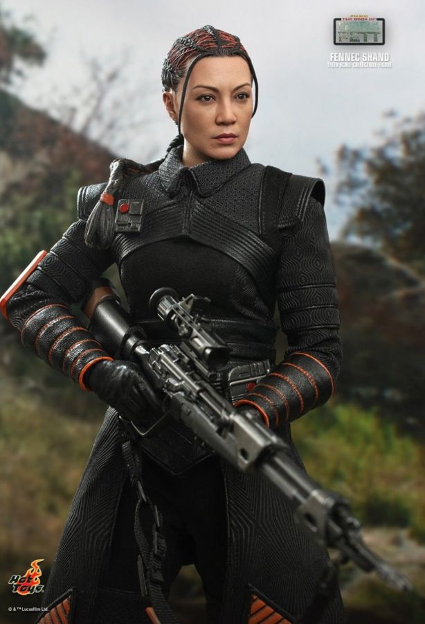 An assassin and elite mercenary, Fennec Shand has worked for all the top syndicates. Clever, capable, and cunning, she is not to be underestimated and is full of surprises. In anticipation to the release of the new The Book of Boba Fett live-action series, Hot Toys is excited to present the new 1/6th scale Fennec Shand collectible figure! The collectible figure features a newly developed head sculpt with stunning likeness, attachable helmet, beautifully tailored costume, a blaster rifle, a blaster pistol, a dagger blade, a drink bottle, a bag with credits, and a themed display stand! The Fennec Shand collectible figure is going to be an extraordinary companion for your Star Wars collection! The 1/6th scale Fennec Shand Collectible Figure specially features: - Newly developed head sculpt with authentic and detailed likeness of Ming-Na Wen as Fennec Shand in Star Wars: The Book of Boba Fett - Highly-accurate facial expression, make up, and detailed skin texture - Newly sculpted brown hair sculpture with orange woven strips and braided ponytail (embedded with bendable wire) - Body with over 28 points of articulations - Approximately 28cm tall - Seven (7) pieces of interchangeable gloved hands including: - One (1) pair of fists - One (1) pair of relax hands - One (1) pair of blaster holding hands - One (1) dagger holding right hand - Each piece of head sculpt is specially hand-painted Costume : - One (1) black colored vest with collars - One (1) black colored undersuit - One (1) pair of black colored gauntlets with orange line patterns - One (1) black belt (able to reveal mechanic details around waist) - One (1) black belt with accessories - One (1) pair of black colored boots with orange line patterns and weathering effects Weapons: - One (1) blaster rifle with belt and removable dagger - One (1) pistol Accessories: - One (1) helmet with mask - One (1) drink bottle with woven bag - One (1) string bag - Three (3) credits - Specially designed figure stand with Star Wars logo and character nameplate View all