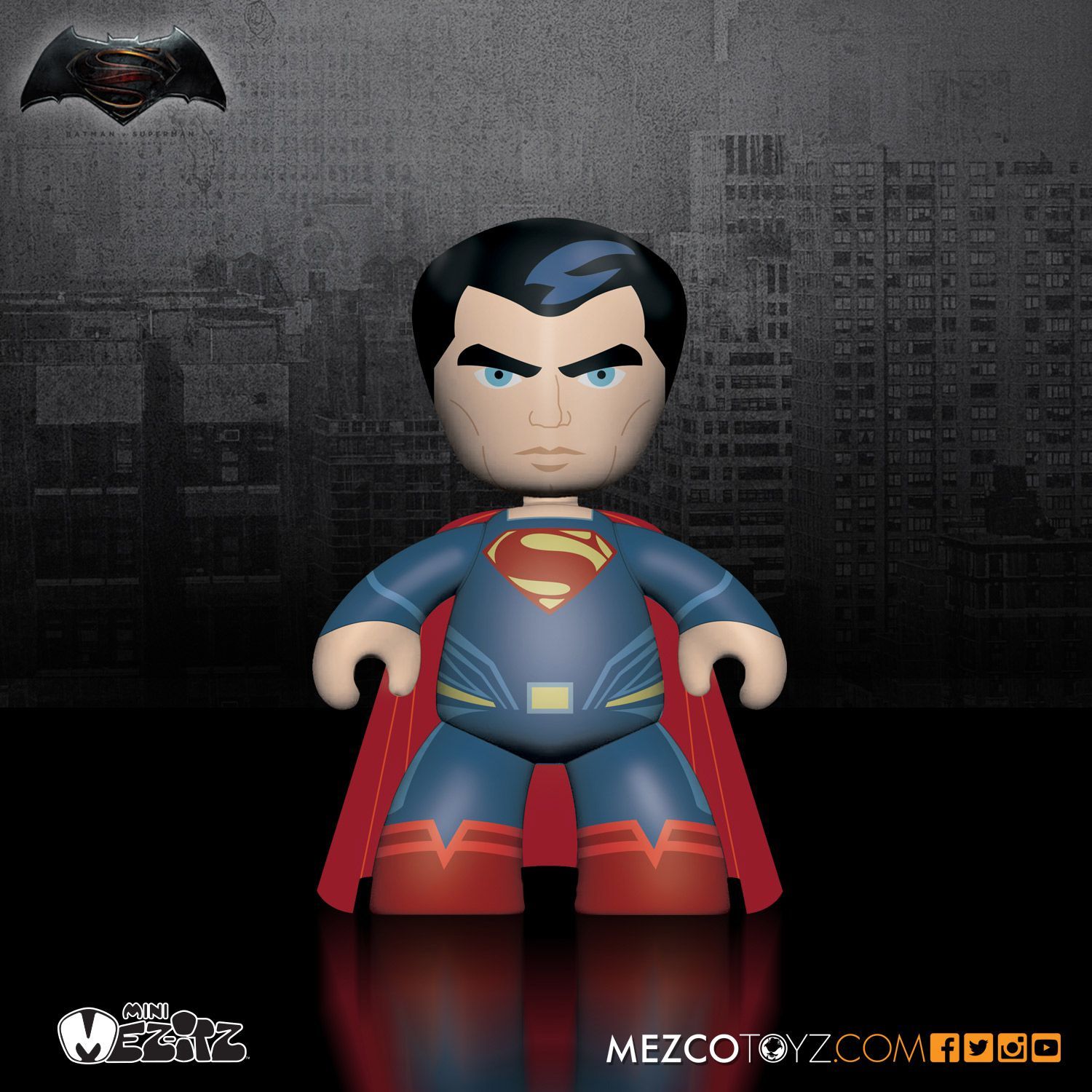 Based on the upcoming epic super hero film, Mezco presents the Batman V Superman: Dawn Of Justice Mez-Itz. This set contains the three characters plus a bonus figure: Superman Batman Wonder Woman Mech-Suit Batman (bonus figure) Each figure stands 2" tall and features five points of articulation. Superman and both versions of Batman come complete with capes. Batman's design features his new film-specific bat-logo. Wonder Woman features her new costume which debuts in the film. Superman's stoic face shows he is ready for the battle to come. Batman's mech-suit looks ready for whatever Superman can throw at him. All four figures are packaged in a collector friendly window box suitable for display. View all