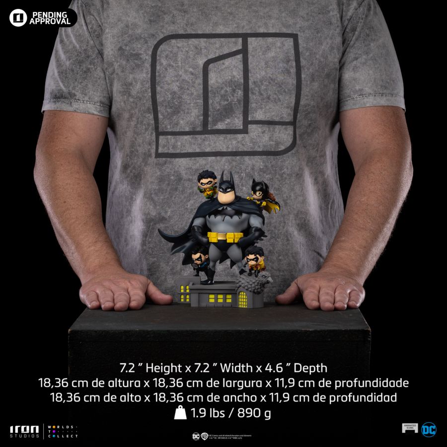 This statue showcases the four heroes who were mentored by Bruce Wayne on a fun and unique scale. On his right shoulder, Tim Drake is ready to throw a Birdarang. On his left shoulder, Batgirl stands determined, watching over the city. Below on the right, Nightwing is investigating with a magnifying glass. Below on the left, Jason Todd stands with a serious expression. At the center, the one who started it all - the superhero, mentor, and father figure - Batman. This is the "Batman Family - DC Comics - Cartoon Deluxe" statue by Iron Studios, set on a base portraying the rooftop of a building in Gotham City featuring windows and a gargoyle at the edge.