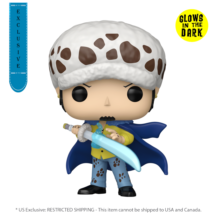 This exclusive, glow-in-the-dark Pop! Trafalgar Law is armed with his sword, Kikoku, and ready for battle with the powers of the Ope Ope no Mi Fruit using his Anesthesia technique.