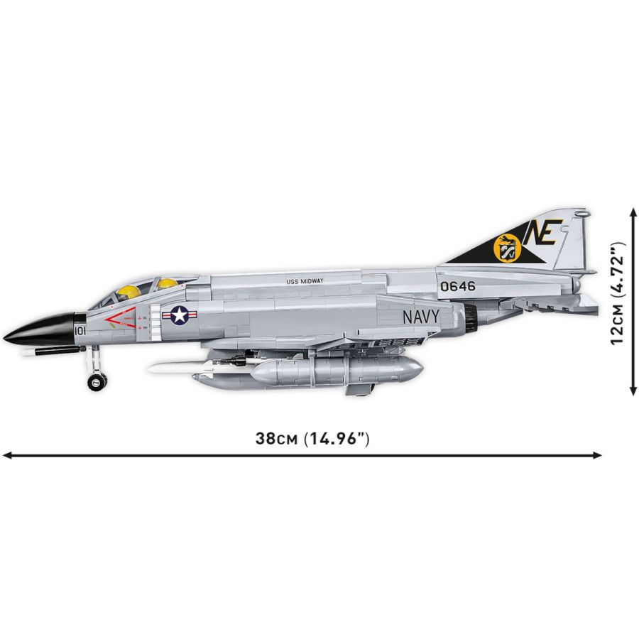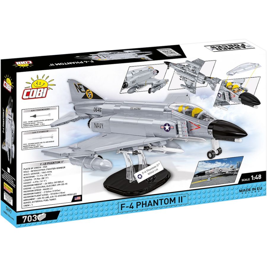 With 703 COBI construction blocks you can build the iconic F-4 Phantom II aircraft in units from the USS Midway aircraft carrier, which can be visited in San Diego (USA). The licensed set was built based on the plans of the F-4 aircraft maintaining the highest attention to block details. The plane has characteristic prints, movable ailerons and detachable landing gear and weapons. The cockpit opens and can be used to place symbolic mini-figures of pilots. The set includes a block display stand and a plate containing the name and scale of the plane. The 1:48 scale model complements the series of planes released as part of the Armed Forces collection! Build history, piece by piece, with COBI.