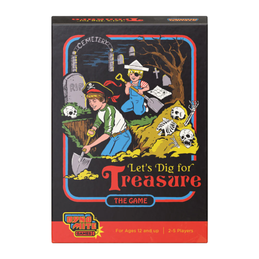 2-5 Players Ages 12+ 10-20 Minutes From the mind of Steven Rhodes, a graphic artist and illustrator best known for his offbeat reimagining of children's activity books from the '70s and '80s, Let's Dig for Treasure immerses you in these hilariously dark retro worlds. The game provides a fortune and glory push-your-luck experience in which you ’ll be digging for all kinds of zany stuff while looking for cards that are worth a lot of points or trigger powerful effects. Just shuffle up the deck and divide it into 3 "Dig Stacks" and you're ready to start digging for treasure! 1. On your turn, choose and "dig up" a card from any of the Dig Stacks. Look for cards worth a lot of points, or cards that trigger a powerful effect, such as stealing a card from another player! 2. You can stop digging at any time, or keep digging up cards for as long as you want. The more cards you dig up before you stop, the more you stand to gain, but be careful! If you dig up a 2nd Worms Card, or even a SINGLE Skeleton Card, your turn will end immediately and you'll lose *EVERYTHING* you dug up so far (this turn)! 3. Once an entire Dig Stack is empty, the game is over and players add up the total point values on their cards! Be sure to look and see if you scored any "bonus point" effects (you did make sure to dig up some Milk to go with your Cookies, right?). 4. You've got all kinds of zany stuff to find while digging, such as Loyal Dogs (protect you from a Skeleton!), Sewer Lines (worth negative points —give them to your least favorite opponent!). Heck, you might even transcend death with The Crown of the Lich Lord, or turn those pesky worms into big points with Skwirmz the Worm God! GAME CONTENTS 120 Cards 1 Rulebook View all