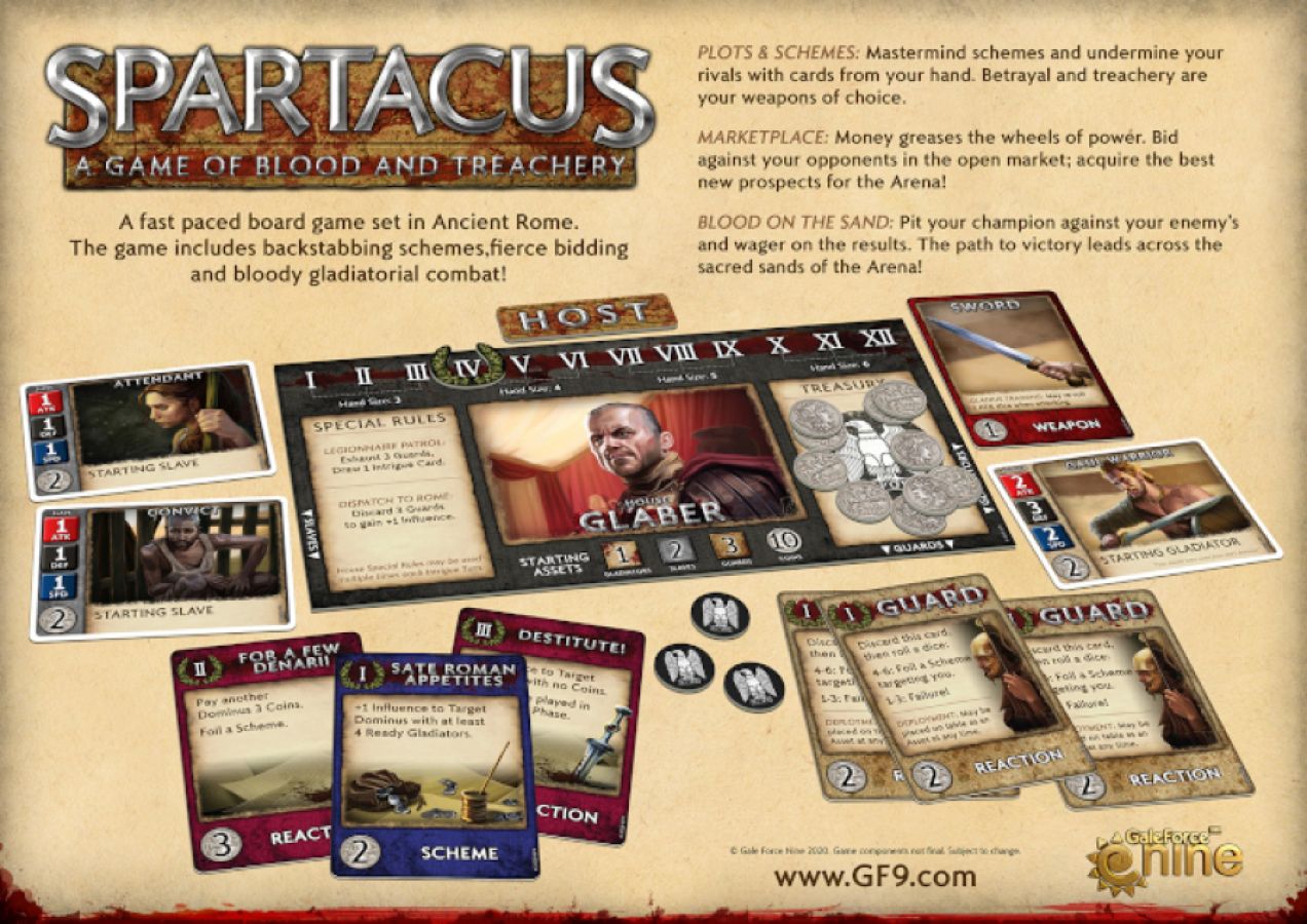 Spartacus: A Game of Blood & Treachery is an exciting game of twisted schemes and bloody combats inspired by the hit STARZ Original series. Players assume the role of the Dominus of a great house competing for influence in the era of ancient Rome. Players vie for dominance through careful diplomacy, cunning intrigues and the glory of the Arena. Undermine the machinations of rivals, leverage your wealth for advantage at market and pit your gladiators in bloody contest all with the goal of seeing your house rise to supremacy.