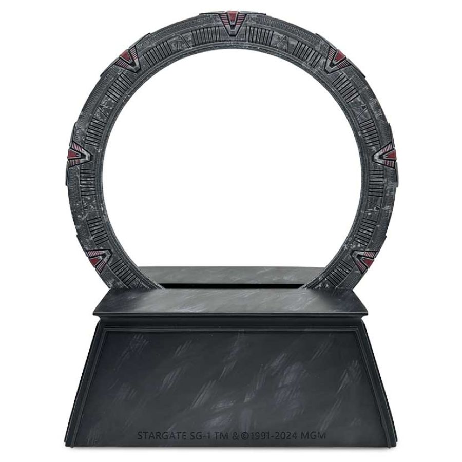 The model is made of a high quality polystone, which holds the detail exceptionally well. The gate itself has a diameter of 9.25" (23.5 cm. It is an individual piece that can be slotted into the display stand, which bears the SG-1 symbol from the planet Earth.