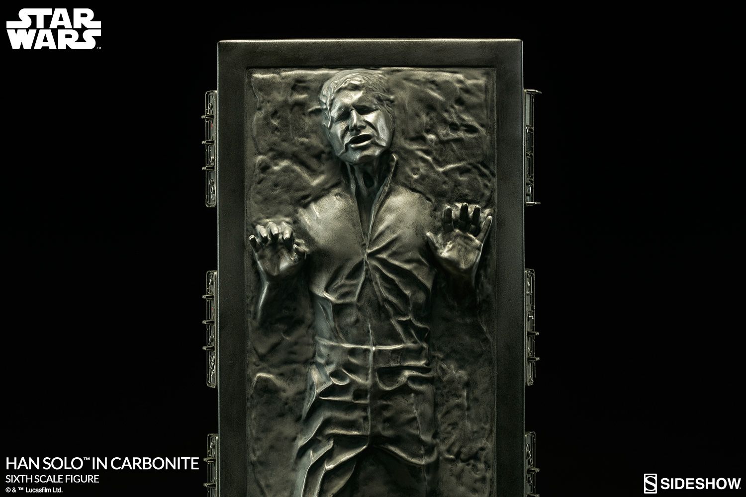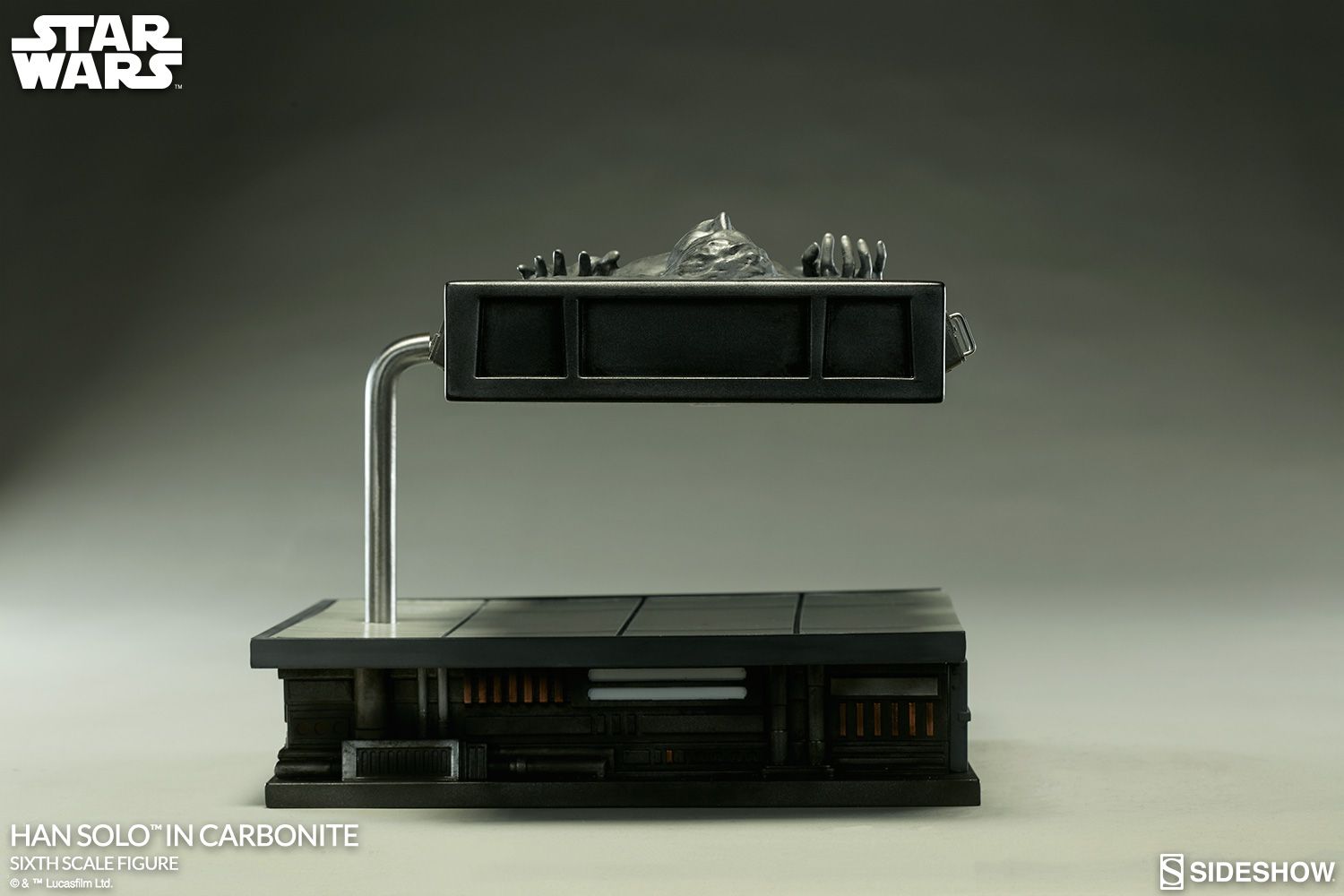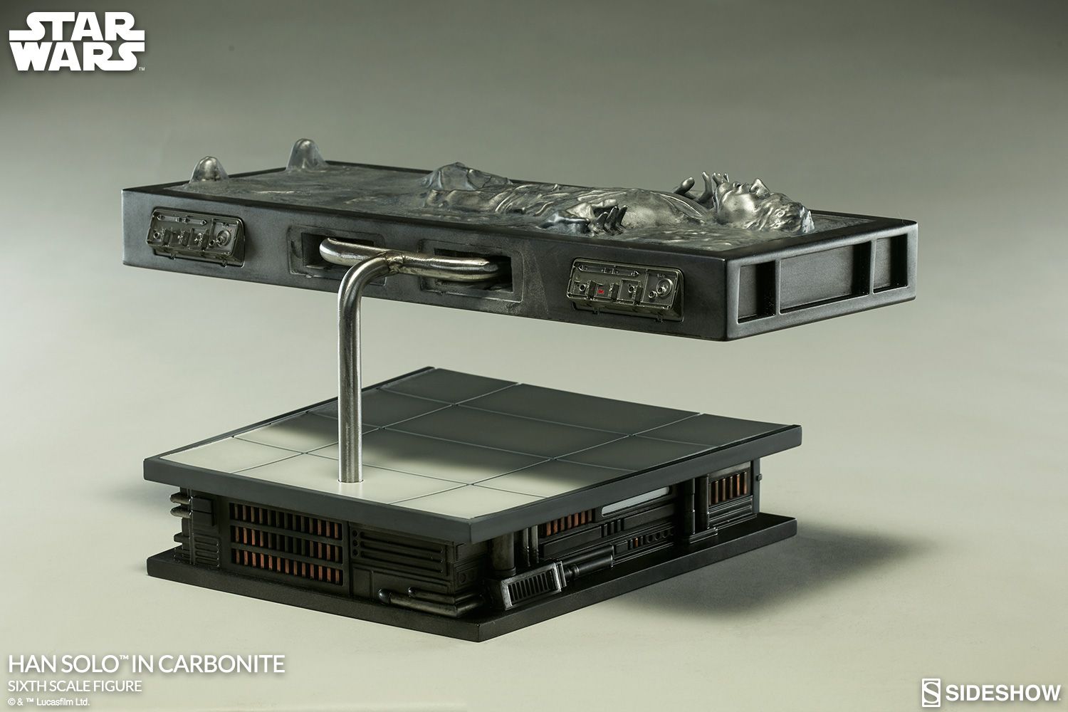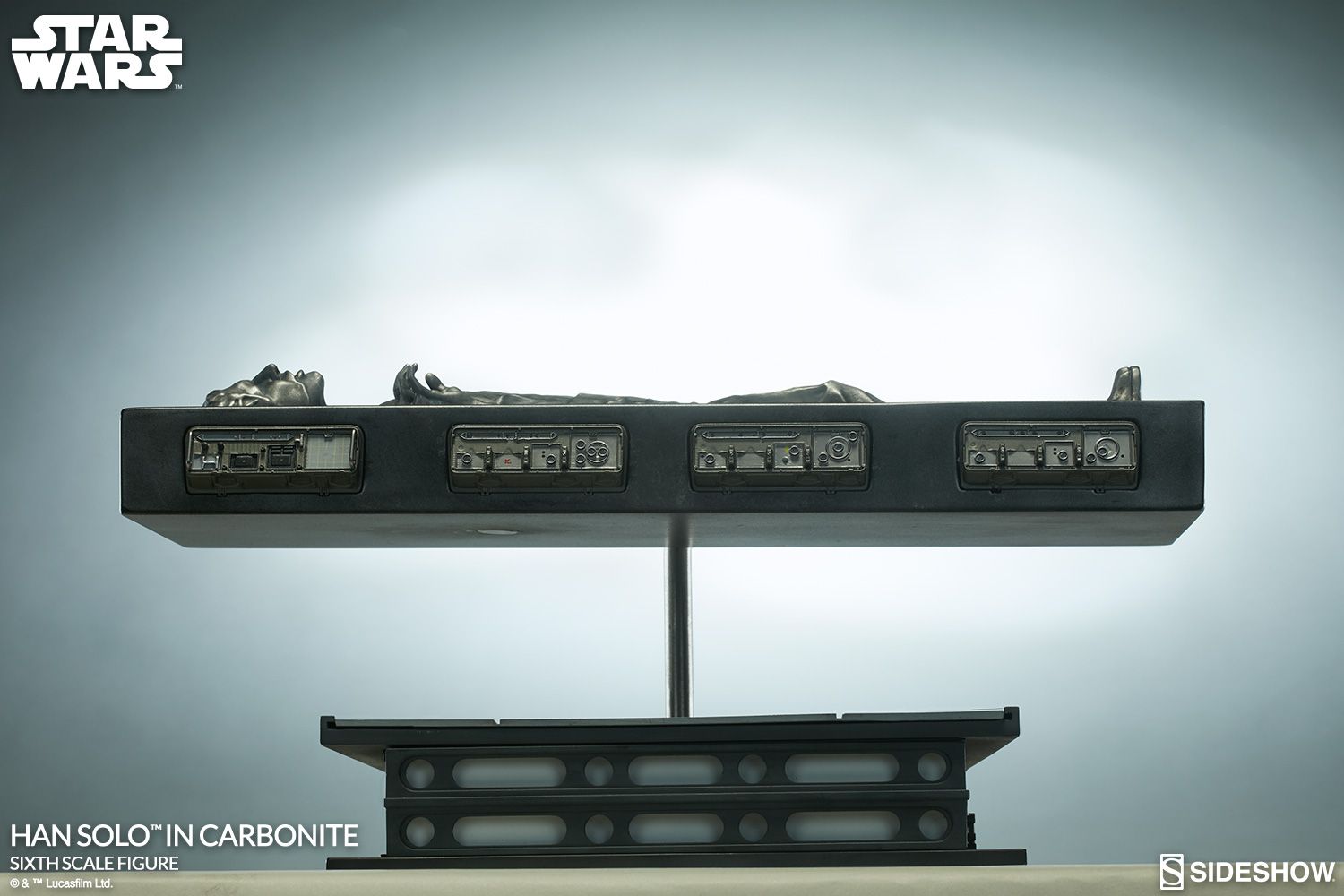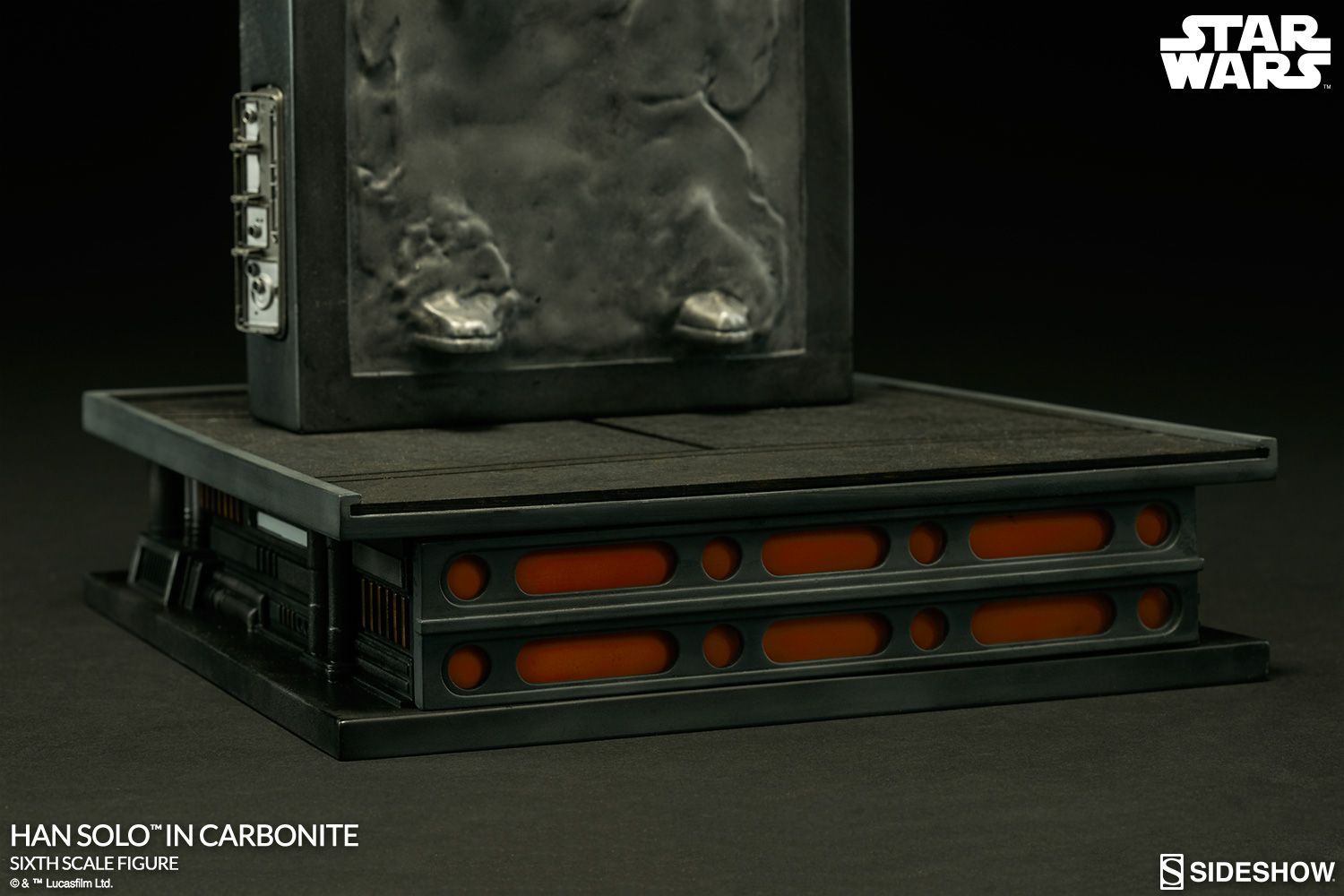 The Han Solo in Carbonite Sixth Scale Figure manages to capture (HA... get it?) the heart-stopping moment when we thought our favorite scruffy looking nerf herder might be doomed forever. Multiple display options allow the carbonite slab to be positioned both horizontally, as it is moved through a Bespin hallway, and vertically, as it rests in the freezing chamber. The base includes swappable floor decos to simulate either scene, the somber exit from Bespin or the dramatic carbon chamber confrontation. Illumination in the base and along the carbon slab control panel completes the impressively detailed presentation. View all