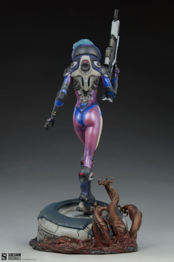 The Bounty Hunter: Galactic Gun for Hire Statue measures 19" tall, swaggering out of her spacecraft after an artful crash-landing on a hostile alien planet. Some of the native fauna doesnt take kindly to the intrusion, reaching up with clawed tentacles to grab at her from beneath the ship. Undeterred, the fearless expert tracker confidently surveys the landscape in pursuit of her target, armed with her trusty blaster and a state-of-the-art space adaptation suit.