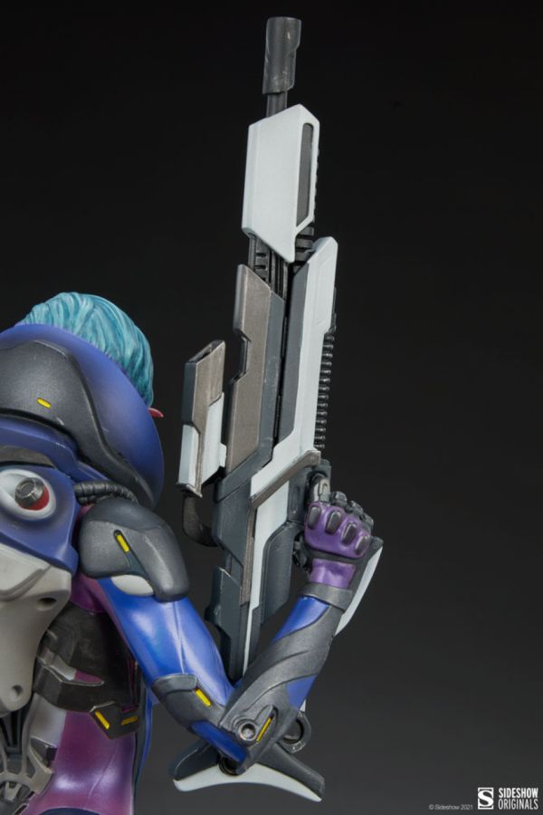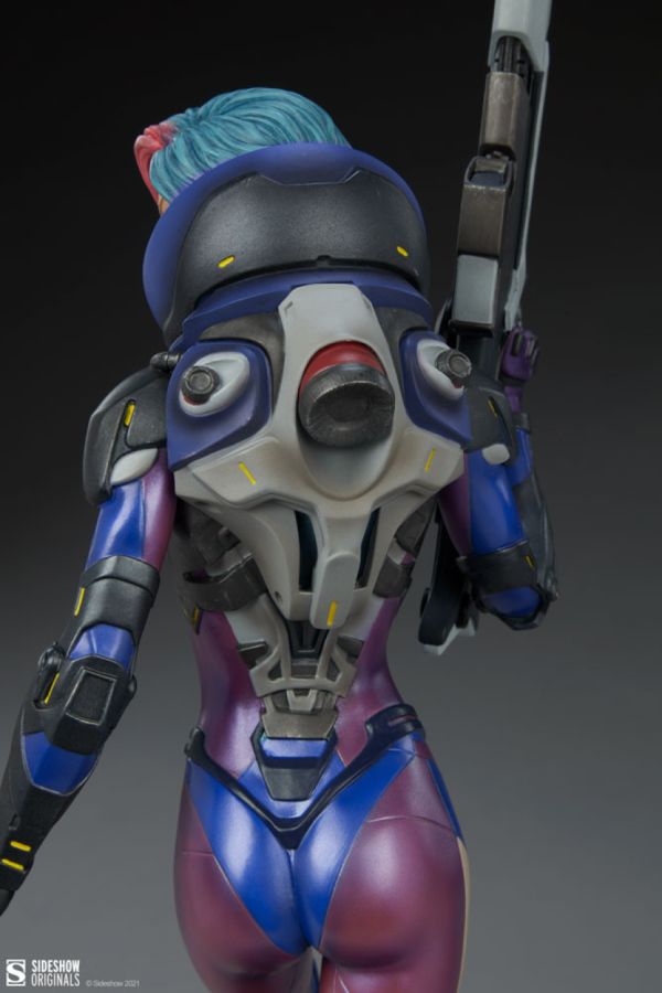 When youre an assassin of this caliber, camouflage is for the weak. The polystone Bounty Hunter statue is equipped for tracking in any alien environment with a highly detailed white, blue, and purple bodysuit integrated with technological implants and support systems. Protected by a rocket-engine backpack, armor, and jump-jet boots, no atmospheric or job-related pressures can phase her. Her cropped haircut is dyed pink and blue, and she has a fierce, calculating look on her face. In her right hand, the Bounty Hunter carries her most important tool of the trade- a large blaster rifle bought with hard-earned credits from countless successful captures, affectionately dubbed Big Bang Betty.