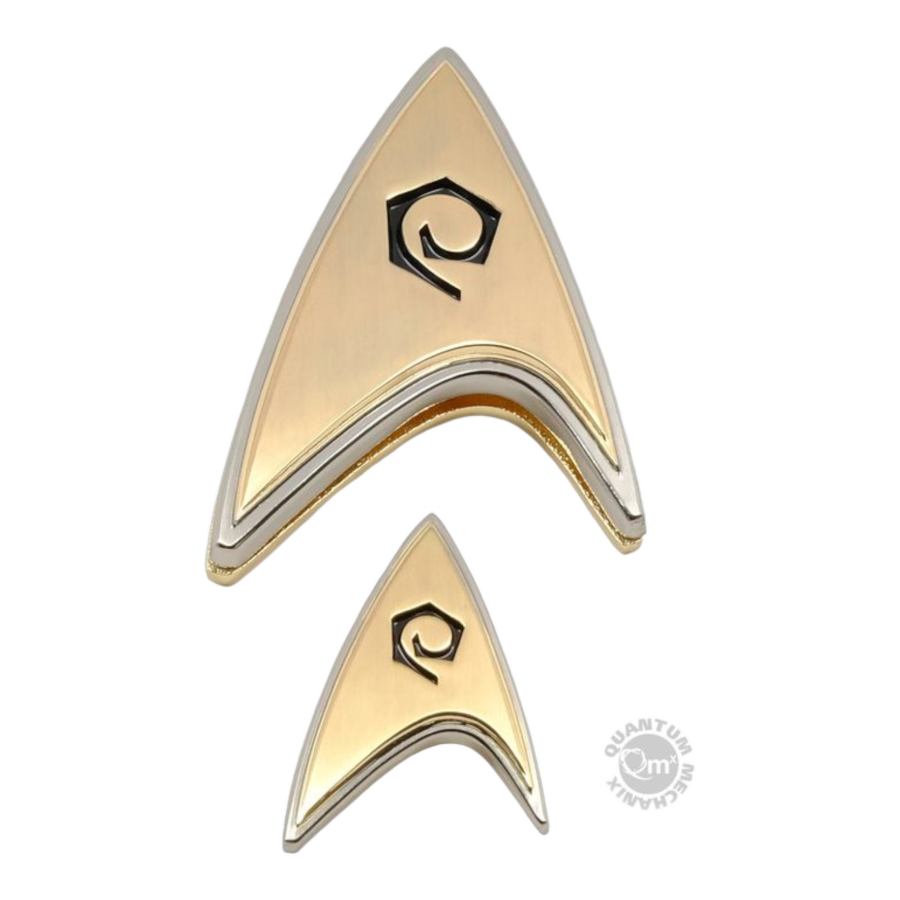 The original USS Enterprise NCC-1701 returns in Star Trek: Discovery, complete with updated uniforms and re-imagined versions of those classic Starfleet insignia. Sideshow and QMx are bringing fans exact replicas of the screen-used Enterprise badges, and we ’re including a miniature lapel pin version of the same design with each badge. The Enterprise badges are inspired by the patches from Star Trek: The Original Series, but also fit with the metallic designs created for Star Trek: Discovery. The new metal badges are shiny gold with a brushed silver outline and a debossed division icon. As with all of our QMx badges, these exact replicas are taken directly from the screen-used hero props. Our wearable badges attach to your uniform using QMx ’s proprietary magnetic clasp, which uses strong, short-field magnets that are embedded in each badge and in a metal backplate. No more pinholes in delicate fabric! They can even be worn on leather and suede. View all