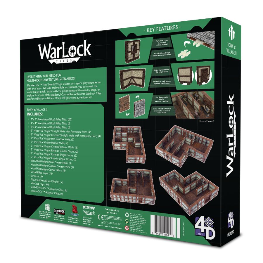 The newest additions to the highly anticipated WarLock Dungeon Tiles line from WizKids are finally available for release! After a year of R&D, Wizkids has perfected the dungeon tile. The WarLock ™ Dungeon Tile system solves many of the problems presented with other tile systems. The WarLock ™ clips allow players to construct rooms in advance and place them on the table as needed. Full height 2" tall walls are perfect for players that want a deeper immersion into their game play. Offset walls provide you with the ability to place figures in any square on the grid, without pesky corners eating into your play area. Experience a perfect, continuous grid through the entire play space with our patented, modular, ultra-slim interior walls. Additionally, all tiles are reversible with wood design on one side and stone on the other for double the functionality! We ’ve also included adaptor clips for two of the most popular clip-based tile systems, DRAGONLOCK ™ and OpenLOCK ™, to help players integrate these tiles into their collection. Key Features: Modular High Utility (Double-Sided) Extraordinary Definition Fantastic Value FLGS Release (No KickStarter) Works With Existing WizKids Products This set includes: 4x - 2" Wood Full Height Straight Walls with Accessory Port 4x - 2" Wood Full Height Cracked Straight Walls with Accessory Port 2x - 2" Wood Full Height Half Window Walls 2x - 2" Wood Full Height Exterior Double Doors 2x - 2" Wood Full Height Exterior Single Doors 4x - 2" Wood Full Height Interior Walls 4x - 2" Wood Full Height Cracked Interior Walls 2x - 2" Wood Full Height Interior Single Doors 8x - 2" Full Height Corner Pillar, Wooden Beams 4x - Wood Full Height Corner Pillars 4x - Wood Full Height Inside Corner Walls 4x- Wood Full Height Outside Corner Walls 2x - 4"x 4" Stone/Wood Dual-Sided Tiles 20x - 2"x 2" Stone/Wood Dual-Sided Tiles 2x - 2"x8" Stone/Wood Dual-Sided Tiles 16x - Wood Edge Caps 90x - WarLock Clips 8x - DRAGONLOCK Adaptor Clips 8x - OpenLOCK Adaptor Clips 4x - Lanterns 4x - Mounted Swords and Shields About WarLock Tiles: The WarLock Tile system solves many of the problems present with other tile systems. The WarLock clips allow players to construct rooms in advance and place them on the table as needed. Our 1" tall walls make it easier for players to move pieces around in the room as they play. Offset walls provide you with the ability to place figures in any square on the grid, without pesky corners eating into your play area. Experience a perfect, continuous grid through the entire play space with our patented, modular, ultra-slim interior walls. Additionally, all tiles are reversible with wood design on one side and stone on the other for double the functionality! View all