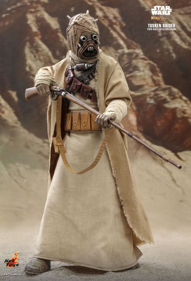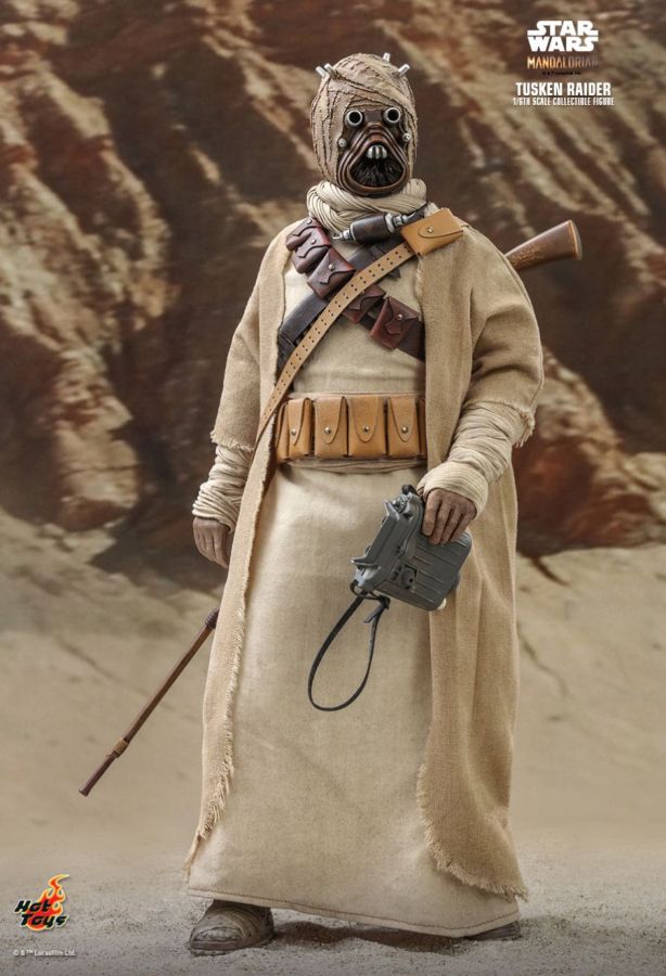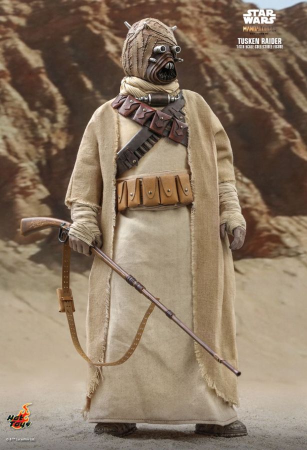 Fearsome desert savages inhabiting the rocky deserts, Tusken Raiders are the foremost reason Tatooine colonists do not wander far from their isolated communities. Extremely territorial and xenophobic, Tusken Raiders will attack with very little provocation. Covered from head-to-foot in tattered rags and robes, Tusken Raiders -- or Sand People as they are also known -- brandish a deadly bladed club known as a gaderffii. Today Hot Toys is delighted to continue expanding its Star Wars collection series by officially introducing the new 1/6th scale Tusken Raider collectible figure inspired by the acclaimed Star Wars series The Mandalorian. The highly-accurate collectible figure is specially crafted based on the appearance of the Tusken Raider. Highlighting the features are the newly developed head sculpt with tattered rags, skillfully tailored outfit, belt and bandolier, the iconic gaderffii and rifle, and a display base. They're raiders, it's true, but these collectible figures will be great additions to any Star Wars collection! The 1/6th scale Tusken Raider Collectible Figure specially features: - Authentic and detailed likeness of Tusken Raider in the live action-series Star Wars The Mandalorian - Newly developed head sculpt with tattered rags, lenses, head spikes and weathering effects - Approximately 31cm tall - Body with over 30 points of articulations - Eight (8) pieces of interchangeable hands with wraps including: - One (1) pair of fists - One (1) pair of relaxed hands - One (1) pair of hands for holding weapons - One (1) rifle holding right hand - One (1) gestured left hand - Each piece of masked head sculpt is specially hand-painted Costume: - One (1) Tusken Raider beige colored robe - One (1) beige colored inner robe with belt - One (1) pair of beige colored pants - One (1) pair of beige colored boots - One (1) beige colored scarf - One (1) pair of beige colored arm warps - One (1) dark brown colored leather-like shoulder bandoliers - Two (2) light brown colored leather-like shoulder bandoliers - One (1) tan colored leather-like utility belt Weapons: - Two (2) gaderffii sticks - One (1) rifle with strap Accessories: - One (1) neck device (wearable on neck) - One (1) black melon - One (1) macrobinoculars - Specially designed desert themed figure stand with Star Wars logo and character nameplate Artists: - Painted by Lok Ho - Art Directed by JC. Hong View all