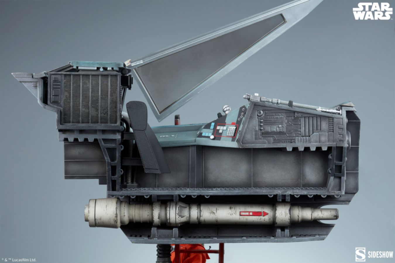 The Luke Skywalker & X-Wing: Red Five, Standing By Premium Format Figure also features a fully sculpted section of Luke's T-65B model starfighter attached to the ladder and robust black fuel tubing. No detail has been spared in recreating this section of the ship's complex armored interior, which starts at the vessels nose and includes a portion of the seat, targeting computer, and flight control panels. Reminiscent of the very first X-wing designs in Star Wars, the clear cockpit window can be positioned either raised or down in order to create your ideal display. With this cockpit feature fully extended the statue measures up to 30" tall. A reinforced internal metal rod supports the entire ship structure - from the interior of the base to the hull - in an incredible, gravity-defying feat.