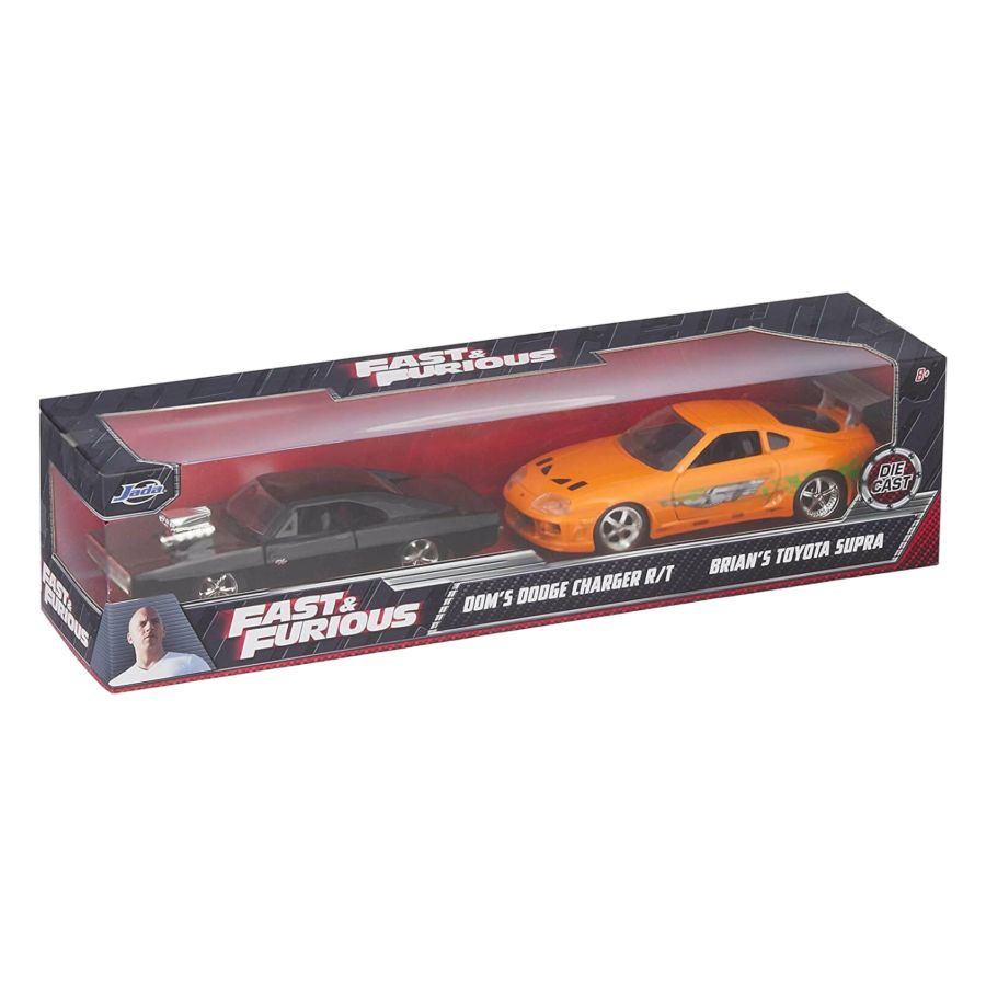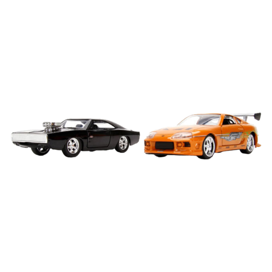 Relive the action-packed scenes from the franchise built on speed with this die-cast collectable twin-pack featuring Doms Charger and Brians Supra ready for action! You call the shots as you lead the team on their crusade with these vehicles as seen in Fast & Furious featuring styling cues directly from the movie
