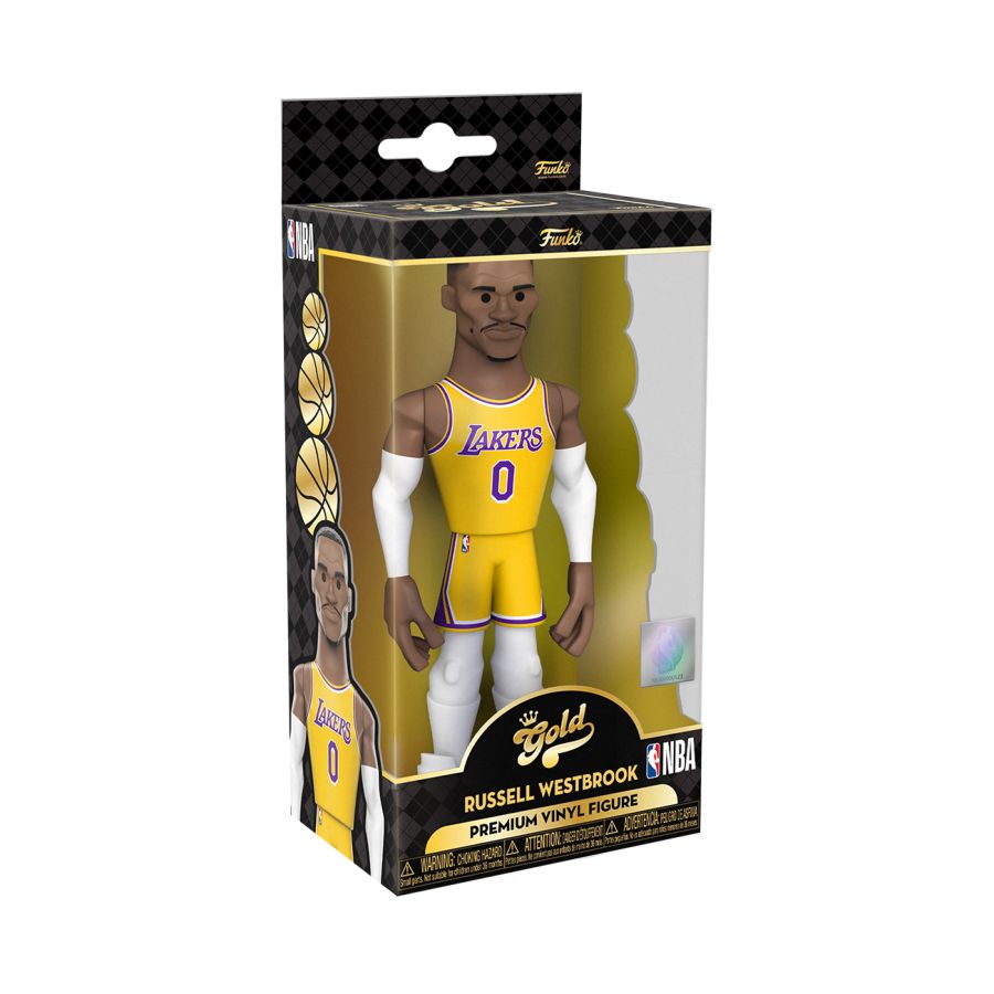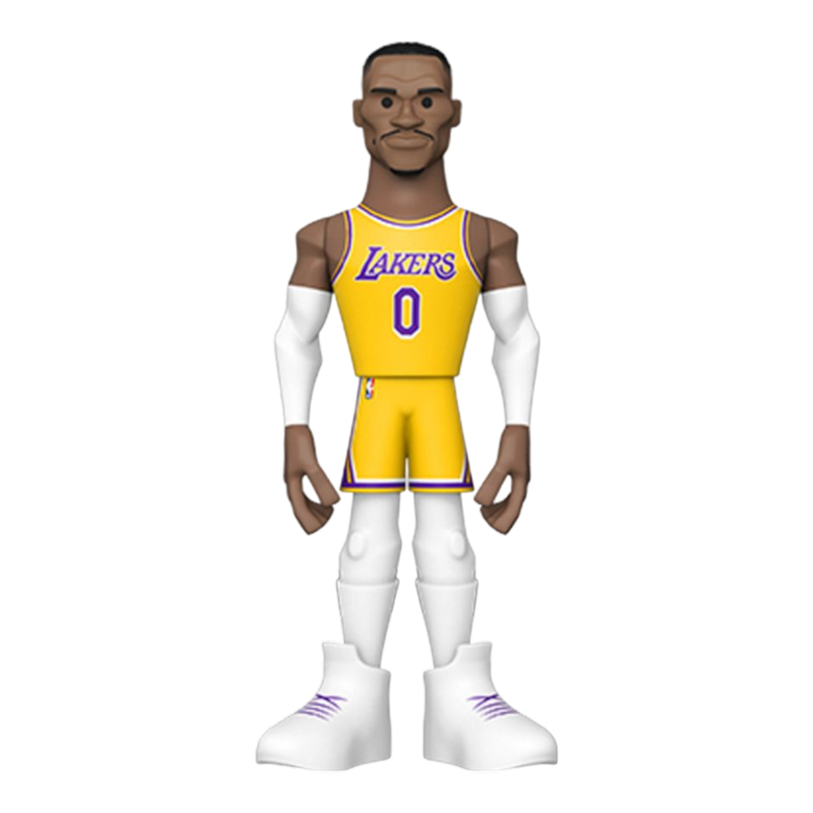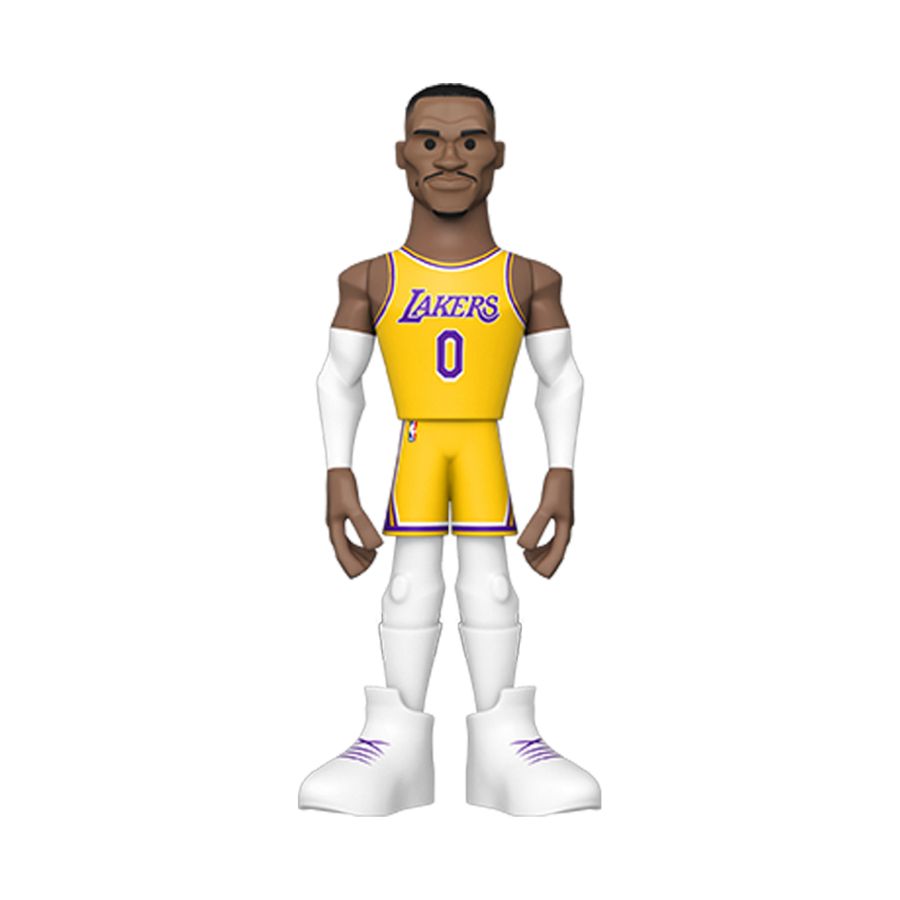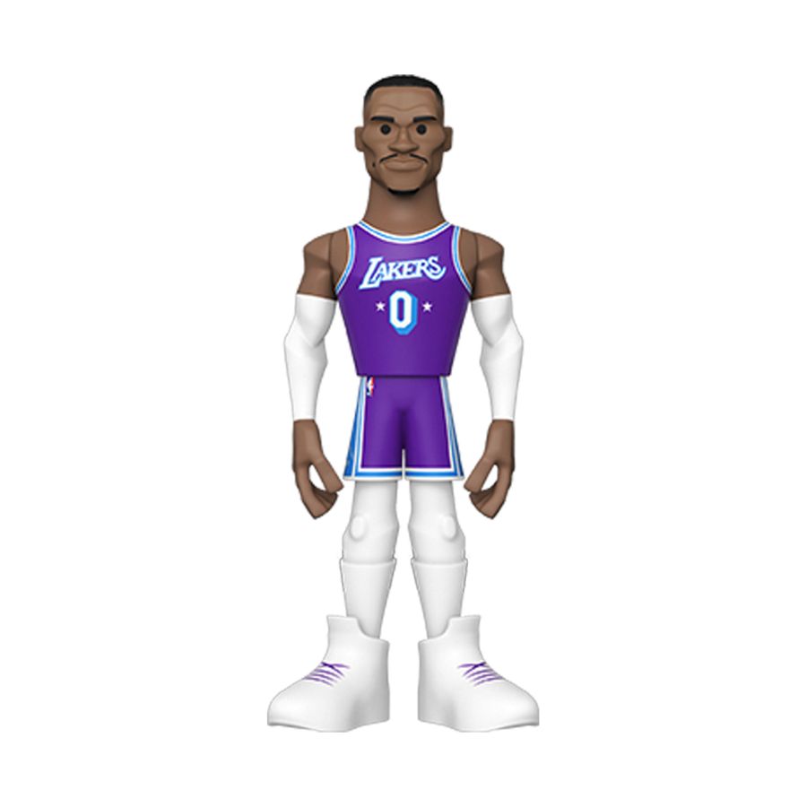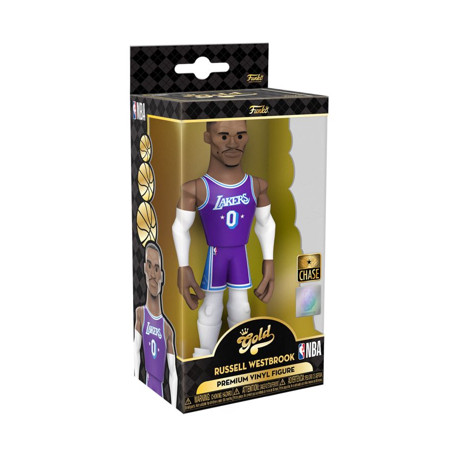 Score a slam dunk for your National Basketball Association collection with the new Funko GOLD Russell Westbrook premium vinyl figure. This 5-inch tall collectible of Russell Westbrook has him dressed in his gold Los Angeles Lakers uniform. GOLD is the perfect way to commemorate some of your favorite NBA players in your collection, and each figure comes in a sleek, display-ready box that is easy to stack with other GOLD collectibles. There's a 1 in 6 chance you may find the chase variant of Russell Westbrook in his purple Lakers away game uniform. Vinyl figure is 5-inches tall. Please note: Chase variants are shipped at random. Receiving a chase with purchase is not guaranteed. View all