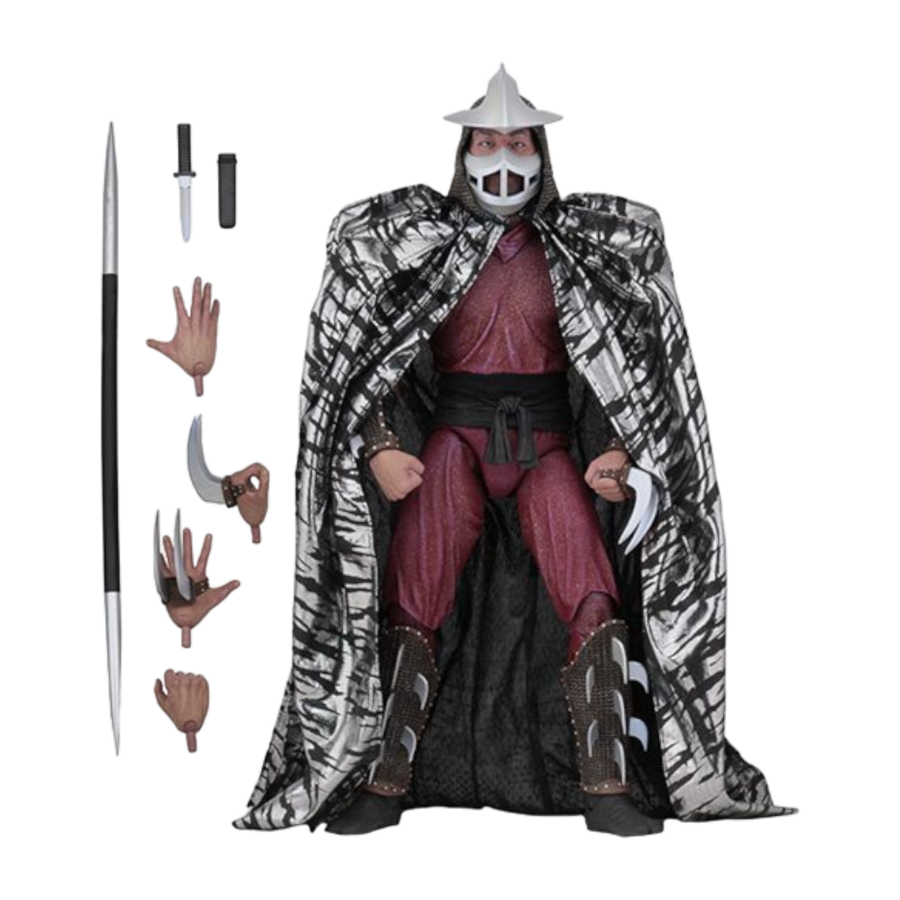 From the 1990 Teenage Mutant Ninja Turtles movie! After wading in a puddle of radioactive waste, four radical reptiles are transformed into New York City ’s greatest crime-fighting quartet. Their biggest enemy? The Shredder, ruthless leader of the Foot Clan, a criminal organization that ’s terrorizing the city. This highly-detailed action figure stands 18" tall and features 30 points of articulation, including double elbows, to showcase Shredder ’s steely skills. Shredder comes with a removable soft goods cape, removable mask, spear, and knife with sheath. View all