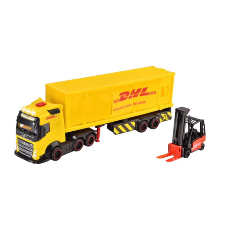 Ready to deliver all parcels on time? With the true-to-original DHL truck, you're sure to succeed! The licensed Volvo FH16 lorry in the classic yellow DHL design measures an impressive 35 cm with its container trailer and rolls smoothly across the nursery floor thanks to its freewheel mechanism. The side-opening loading area and an additional forklift truck make it easier to load and unload the postal freight - the matching goods are supplied as play accessories.