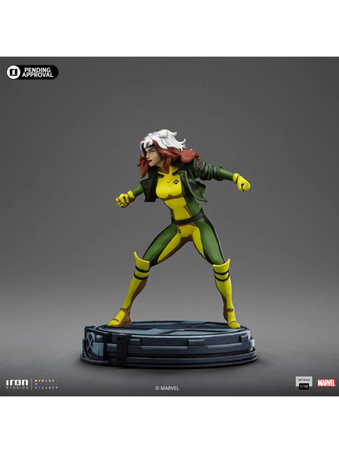 When Rogue was 13 years old, she put her first boyfriend Cody into a coma when her powers manifested during her first kiss. With the mutant power of absorbing the life force and psyche of others through skin-to-skin touches, her father disowned her, and she ran away from home, getting rescued by the shapeshifter mutant Mystique in disguise. Seeing her as her mother, Mystique raised Rogue and taught her how to use her powers for stealing for years. Rogue joined the Brotherhood of Mutants and, to broaden her powers, Mystique prepared a trap to the original Miss Marvel superhero. During the theft of a jet aircraft in a military base, Miss Marvel and Rogue fought, and since Rogue held and touched her for so long, she acquired enhanced reflexes, flight, invulnerability, and superhuman strength, after permanently stealing Miss Marvel ’s powers, putting the hero into a coma. She also absorbed Miss Marvel's personality and almost went crazy. Rogue ran from Mystique and was found by Professor X who felt her anguish and despair. She then got better and became Charles Xavier ’s student, joining and X-Men where she fell in love with Gambit. Presenting innovation in her painting in the form of a specific shading that highlights all the figures from this new collection as if the characters were coming out of the TV to the real world, Iron Studios bring the statue "Rogue - X-Men '97 - Art Scale 1/10", over a themed base in the "X" shape of the logo of the super group of mutant heroes. View all