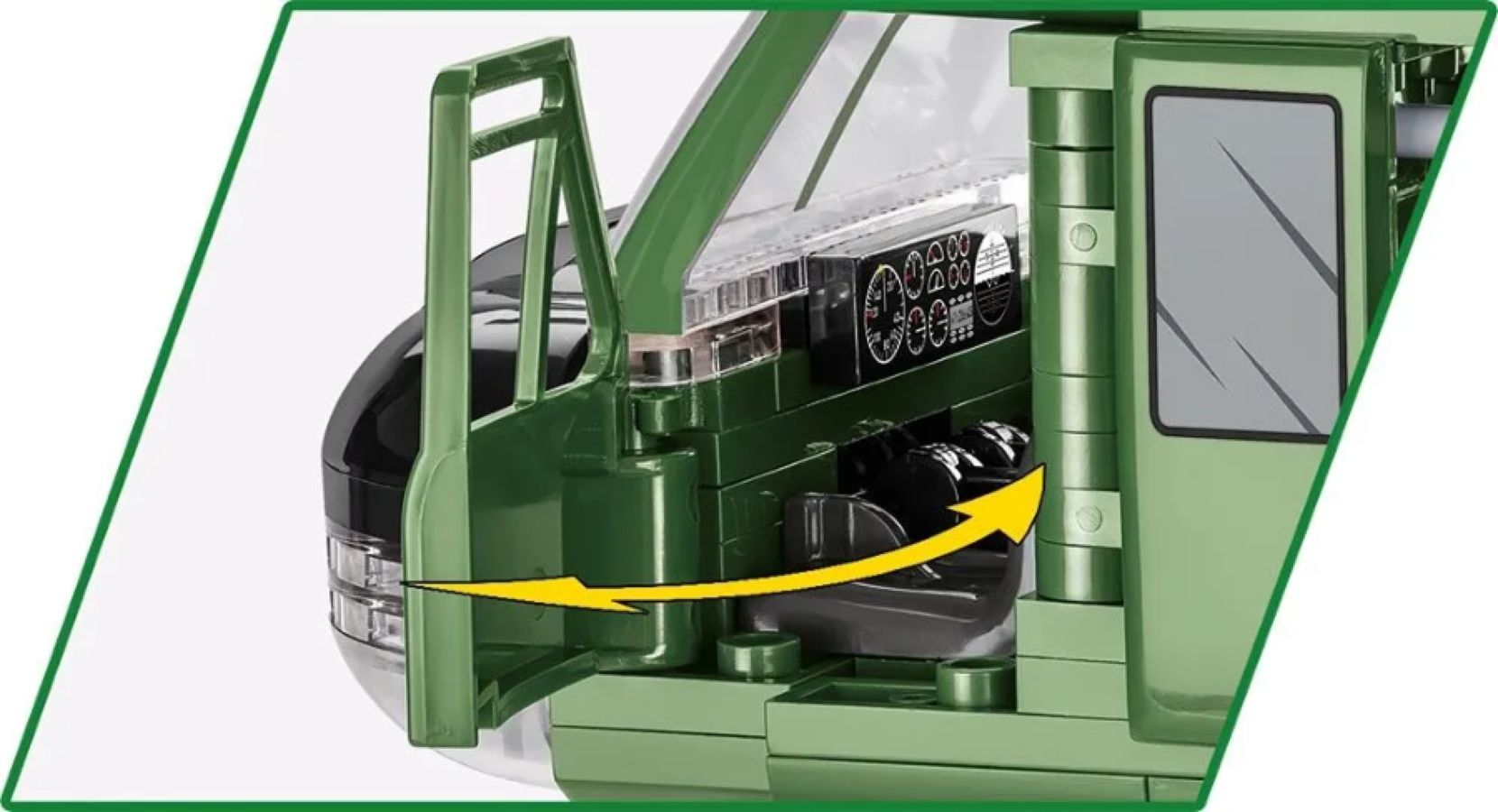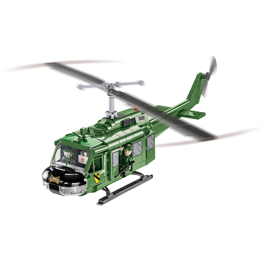 You can build the extremely popular American Huey helicopter, accurately reproduced in 1:32 scale, from a set of COBI construction blocks. The set was released in the Vietnam War series under the license of the American manufacturer of commercial and military helicopters Bell Helicopter Textron. Measuring 39 cm in length, the model has been covered with high-quality prints that do not wear out even during intensive use. The prints are characteristic of the US air cavalry and imitate the details of the equipment. The helicopter is also equipped with rotating blades and sliding doors.
