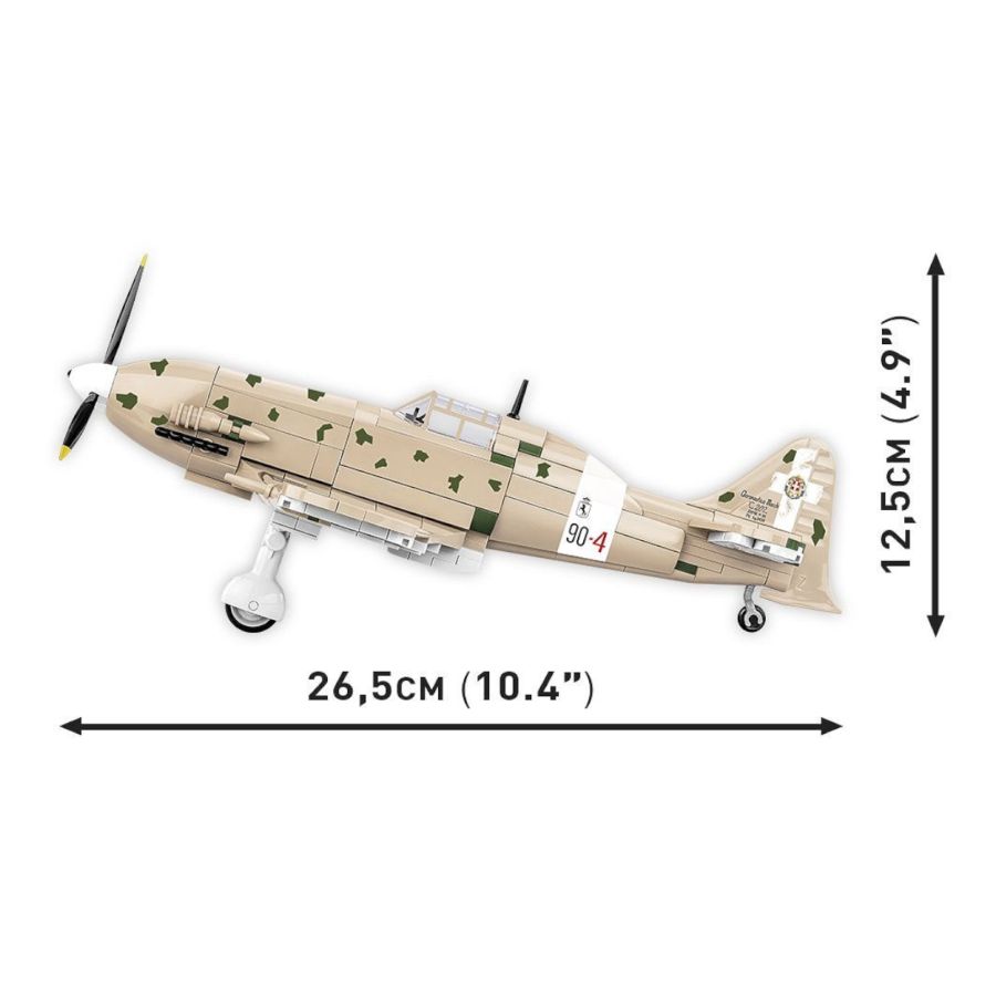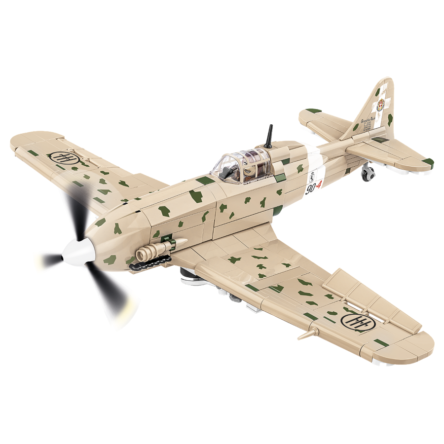 Made of 404 elements, the plane introduces a breath of Mediterranean freshness to the COBI collection. The model has camouflage from the theater of operations in the Mediterranean basin. Using durable and permanent prints, green spots were applied to the sand base, blurring the silhouette of the machine in the air. The fighter has a folding landing gear, movable flaps and a perfectly reproduced figure of an Italian pilot can be placed under the removable cockpit canopy. The plane has a standard display stand with the name and a transparent pilar, thanks to which the plane looks like its flying.