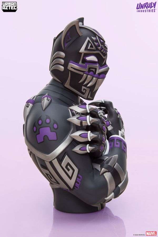 The strength of two warrior cultures combines in the Black Panther (Purple Edition) Designer Collectible Bust by artist Jesse Hernandez, AKA Urban Aztec. T ’Challa flexes his claws in a Wakandan salute, wearing his futuristic Vibranium suit infused with ancient design sensibilities. This limited-edition convention exclusive variant is fit for a king — unleash the energy of the Black Panther on your Marvel collection today! About the Artist: Jesse Hernandez (@UrbanAztec) is a visual artist born and raised in the San Francisco Bay area, most widely recognized for his street art murals, vinyl toys, and diverse Illustration work. His style is known as Urban Aztec, a combination of graffiti and ancient indigenous culture. Hernandez ’s artwork has been featured by Warner Bros., the San Jose Sharks, the Oakland Museum, Rockstar energy drink, Rolling Stone magazine, Fandango, Juxtapoz, Gears of War 4, X-Box, Playstation, Run the Jewels, Oakland Athletics, and the Cosmopolitan Las Vegas. Hernandez has shown art in galleries and museums around the world. He has also painted murals in Oakland, San Francisco, Los Angeles, Mexico City and Amsterdam. View all
