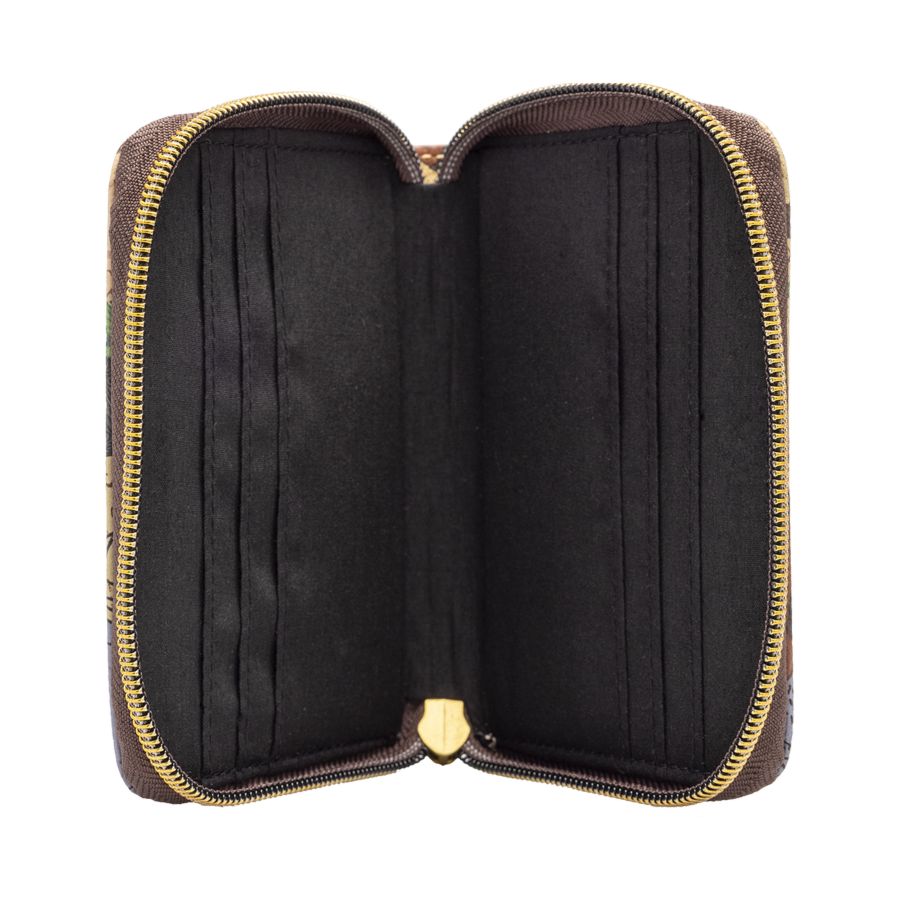 Wallet features include sturdy antique gold-coloured metal hardware, 6 card slots, vegan leather (polyurethane), and printed details.