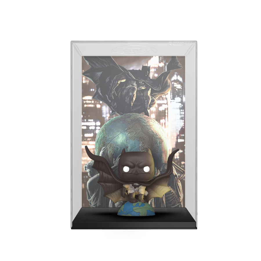 Perched atop a globe, Pop! Batman mirrors the striking cover art behind him.
