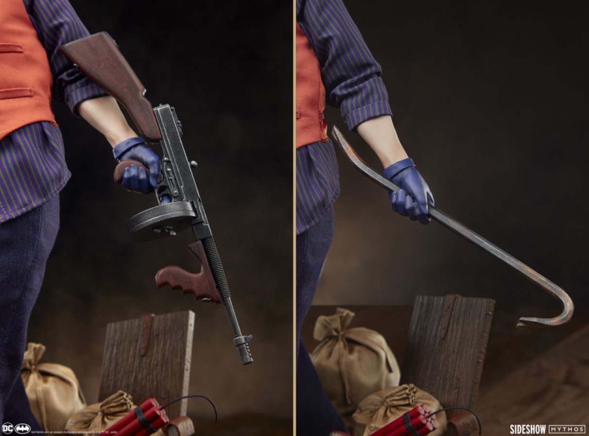 The Joker and Harley Quinn: Lawless Love Diorama finds these two lovers on the lam in their glitzy hideout, the circular base stacked with dynamite, dollar bills, liquor, and stolen money bags. This highly detailed mixed media collectible features polystone elements as well as fabric costuming based on the time periods distinct fashion. Ever the gentleman, The Joker wears a purple and orange three-piece suit, with purple gloves and a green tie to finish the look. His darling dame sports a diamond-patterned, high-collared dress with a wire in the skirt hem for posing, as well as a matching pill box hat and kitten heels. The 1:5 scale DC statue also includes swap-out hands for each character. Harley's right hand can be changed to hold either a pistol or knife, while The Joker's left hand can be alternated between a crowbar and a submachine gun.