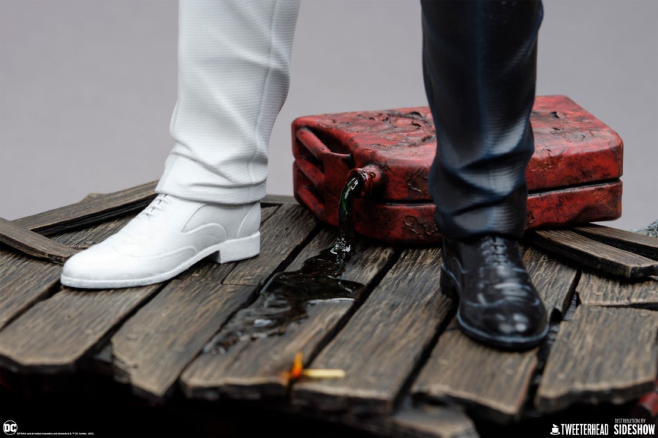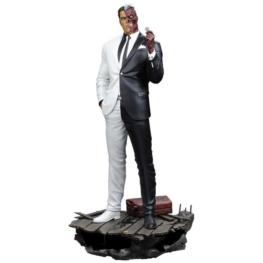 This fully sculpted polyresin statue comes with Two-Face in his striking black and white suit in a warehouse environment. He stands in a powerfully confident and contemplating pose, about to make the final call as to whether or not he will let it all burn down in the only way he can: with the flip of his coin...