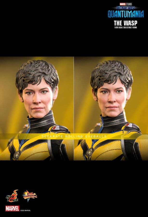 Serving as the head of Pym van Dyne Foundation, Hope Van Dyne a.k.a. the Wasp has always been focused on using the Pym ’s technology to save her mother from the Quantum Realm, and now she ’ll be dealing with the reality of having achieved that goal. Ahead of the official release of Ant-Man and the Wasp: Quantumania, Hot Toys is introducing the latest 1/6th scale The Wasp collectible figure with her completely new appearance. Beautifully crafted based on the screen appearance of Evangeline Lilly as Hope Van Dyne in the film, the amazingly-detailed figure features a newly developed head with separate rolling eyeball function, detailed short hair sculpture, a newly developed helmeted sculpt with LED light-up function that bears a high resemblance of a closed helmet showing part of the Wasp ’s face, two styles wings including collapse wings and moveable wings for flying poses, a navy and yellow colored costume, an opened helmet accessory attachable to the back of figure, Ant-Man miniature diorama and a figure stand. Venture to the Quantum Realm with the Wasp figure! The 1/6th scale The Wasp Collectible Figure specially features: - Authentic and detailed likeness of Evangeline Lilly as Hope Van Dyne/ Wasp in Ant-Man and the Wasp: Quantumania - One (1) newly developed helmeted head sculpt with LED light-up function (battery operated) - One (1) newly developed Hope Van Dyne head sculpt with separate rolling eyeball function - Movie-accurate facial expression with skin texture and make-up - Newly developed body with over 28 points of articulations - Approximately 29 cm tall - Two (2) styles of interchangeable Wasp ’ wings including: - One (1) pair of movable wings(approximately 31.5cm in length) - One (1) pair of collapse wings - Six (6) pieces of interchangeable gloved hands including: - One (1) pair of fists - One (1) pair of relaxed hands - One (1) pair of open hands - Each piece of head sculpt is specially hand-painted Costume: - One (1) black, yellow colored Wasp suit with embossed patterns and blue trims - One (1) pair of black colored boots Accessories: - One (1) Ant-Man miniature diorama (approximately 3.5cm tall) - One (1) attachable opened helmet accessory - A figure stand with movie logo and character name