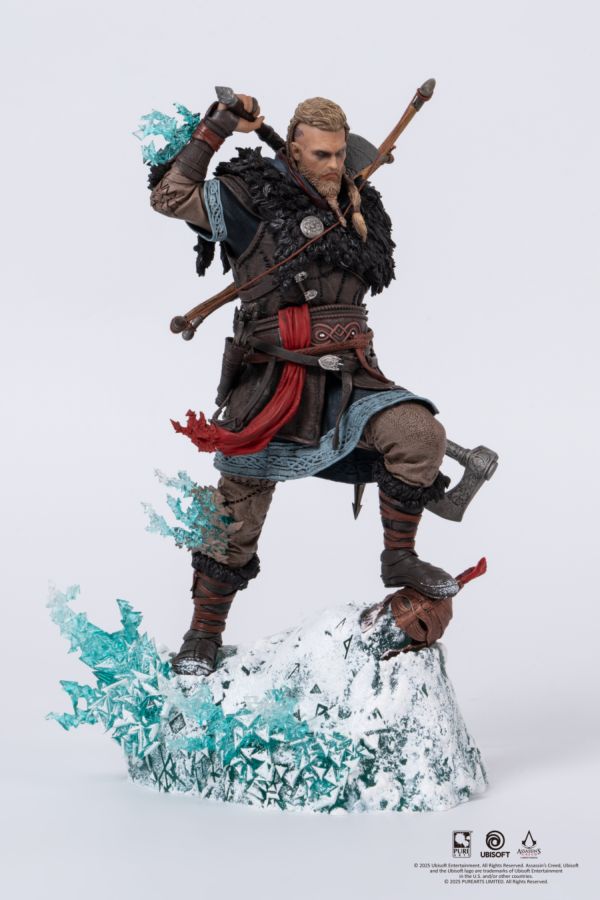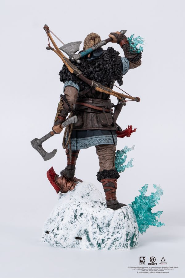 The iconic PureArts Animus Eivor ¼ Scale Statue, now in a 1/8 Scale Statue! Fierce Viking raider and protagonist of Assassins Creed Valhalla Eivor is battle-hungry with the severed head of his enemy at his feet on an icy base. Inspired by ice crystals, the quintessential PureArts animus-LED effect representing the bridge between past and present materializes from Eivors left side. Standing at 11 inches tall, the Animus Eivor 1/8 Scale Statue is the perfect size for any Assassins Creed fans set up!