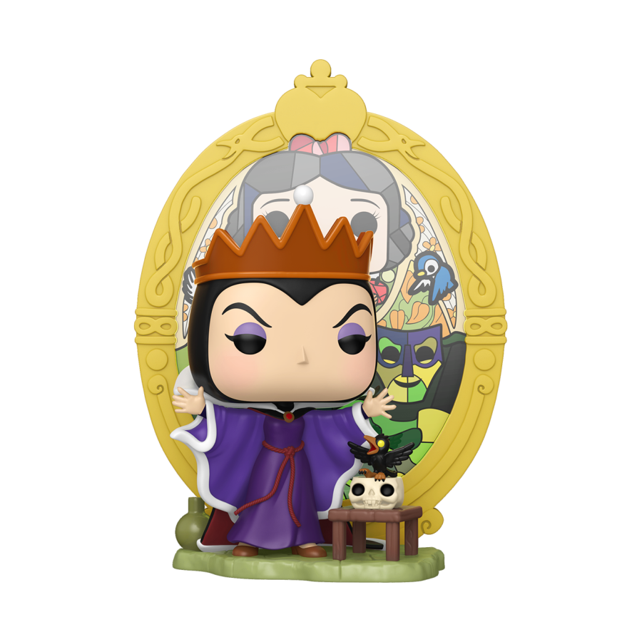This jealous ruler is framed by a stunning stained glass-inspired background, which features POP! Snow White and more details from Disney's Snow White and the Seven Dwarfs.