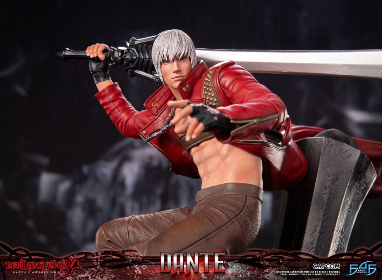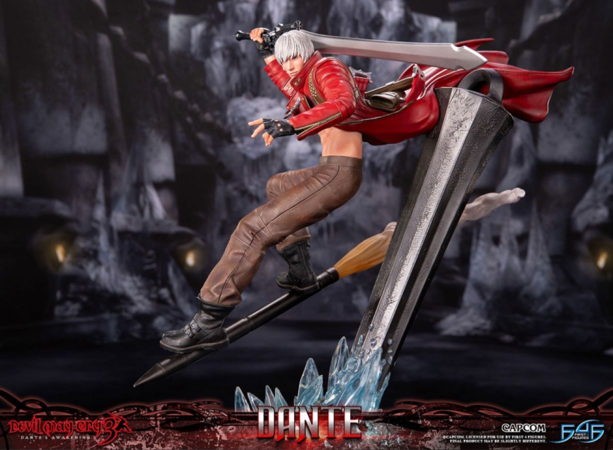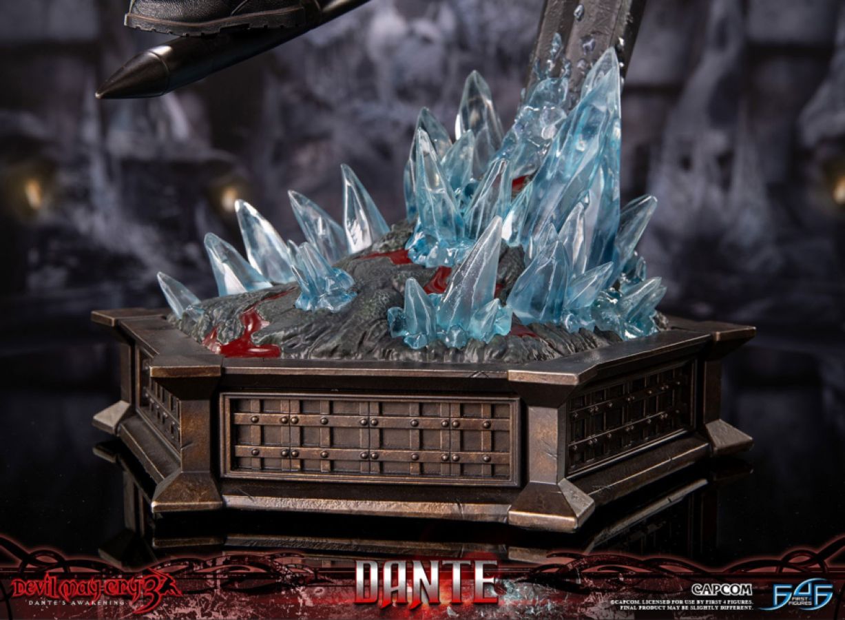 The statue is inspired by the intense boss fight with Cerberus. It features Dante confidently wielding his sword, Rebellion, in his right hand while riding on the rocket that Lady fired at him after the epic battle. The highly detailed base beautifully captures the icy surroundings and desolate atmosphere of the entrance in the Ice Guardian's Chamber.