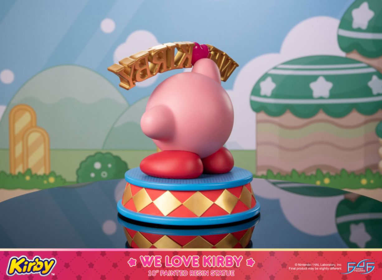 The statue is inspired by the "We Heart Kirby" sign that emerges from the ground at the end of the game. The "We Love Kirby" statue is beautifully replicated by having the original scheme. The words "We Heart Kirby" are portrayed in gold and the heart is a bright metallic pink. The glossy finish in Kirby's iris with the gradient makes him look more animated. His body and feet have a matte finish which makes it seem as if Kirby is holding up the sign himself.