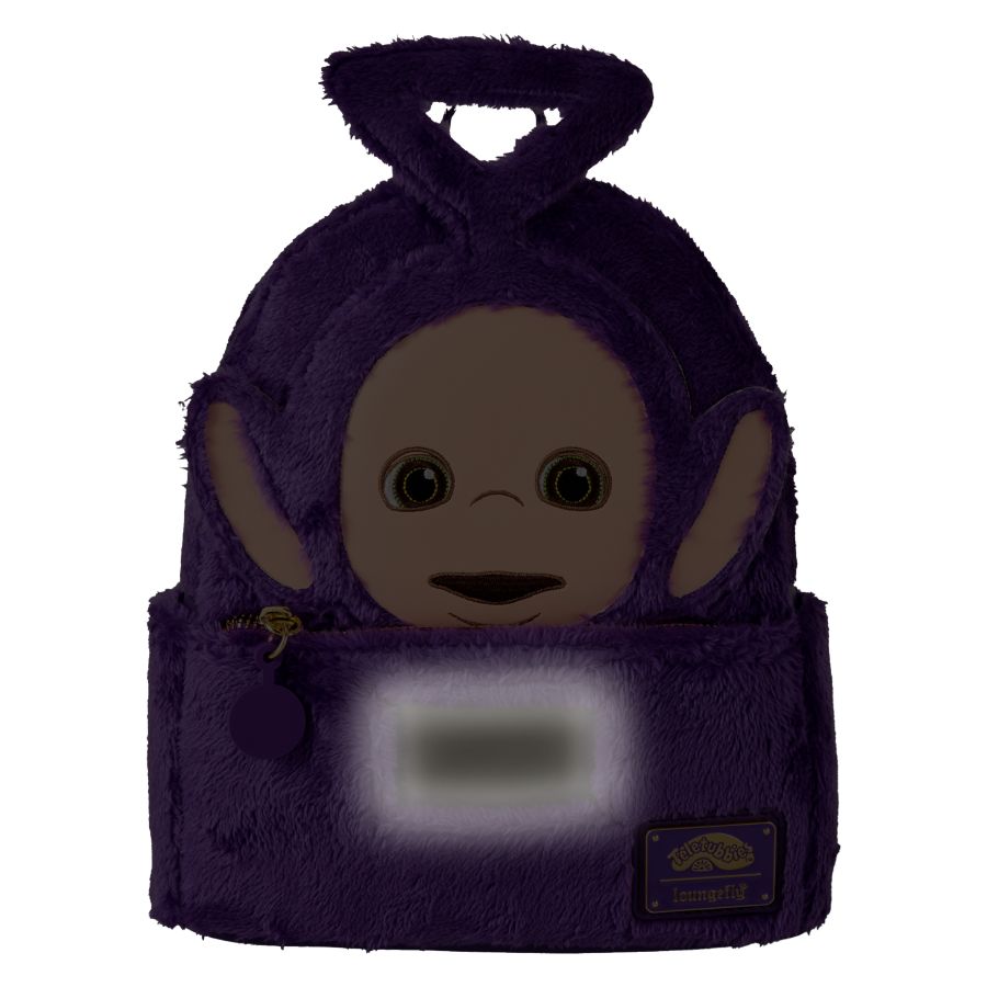This bag is modeled after Tinky-Winky. It's covered in purple faux fur and the front pocket imitates the screen on Tinky-Winky's tummy with a light-up panel.