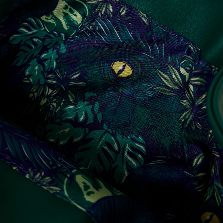 Foliage designs cover this bag and the top flap is in the shape of a leaf. When it's secured in place, you can see the eye of a velociraptor peeking through. Lift the flap to reveal the entire dinosaur! Crocodile faux leather gives it an extra Jurassic-era feel.