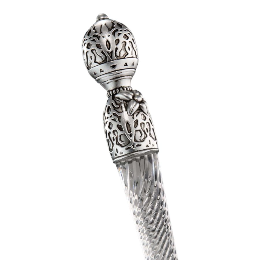 Complete with embossed details and antique silver-coloured deco with a patina finish, this 22" prop replica wand comes in a Glinda-pink leatherette collectors box.