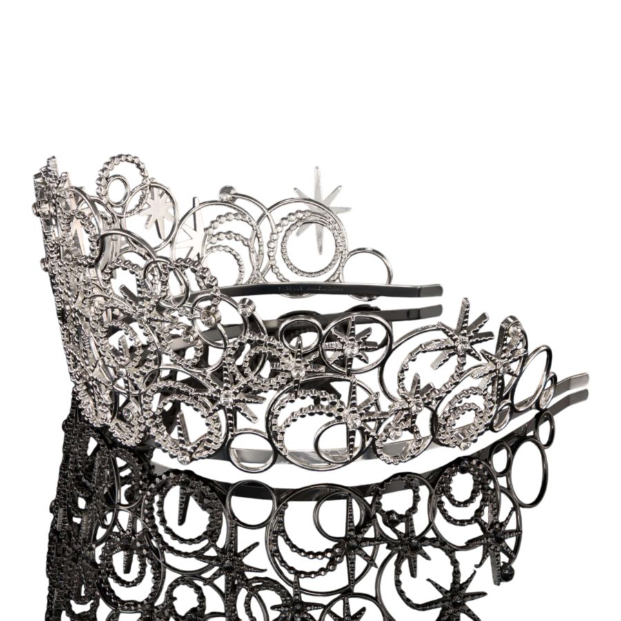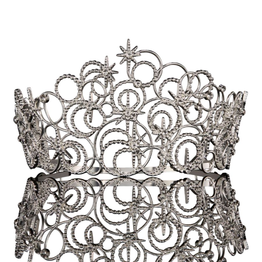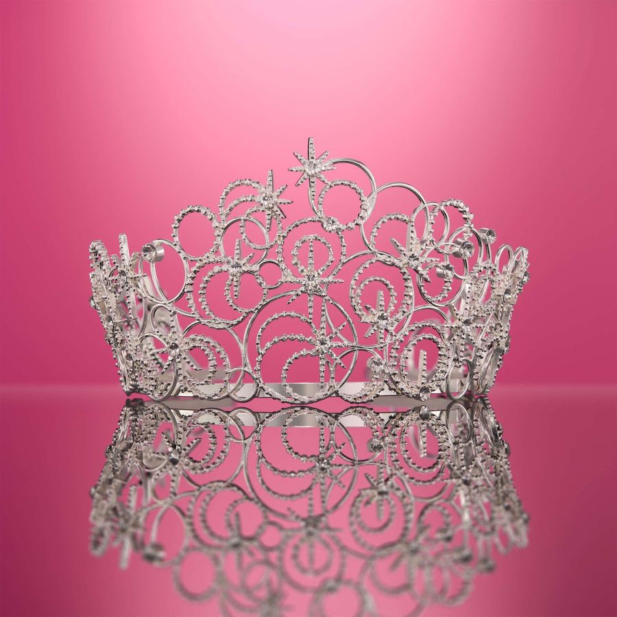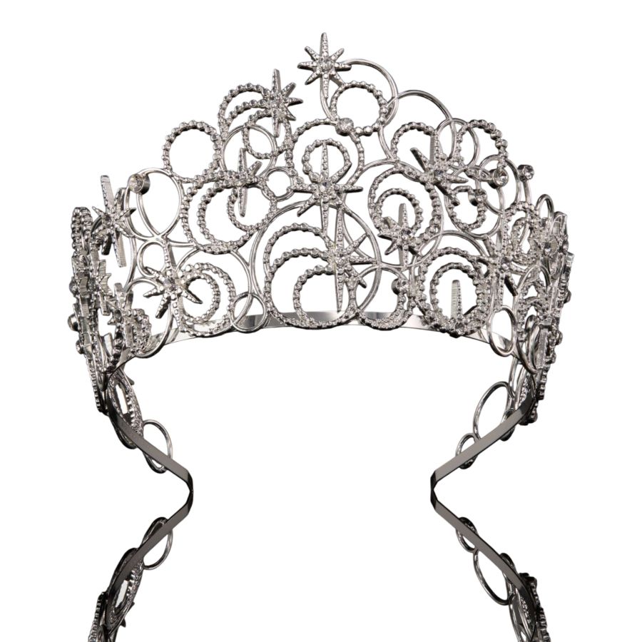 The intricate details of Glindas Bubble Crown are recreated in shining silver-plated metal with iridescent European crystals, housed inside a Glinda-pink collectors box with gold detailing and pink ribbons.