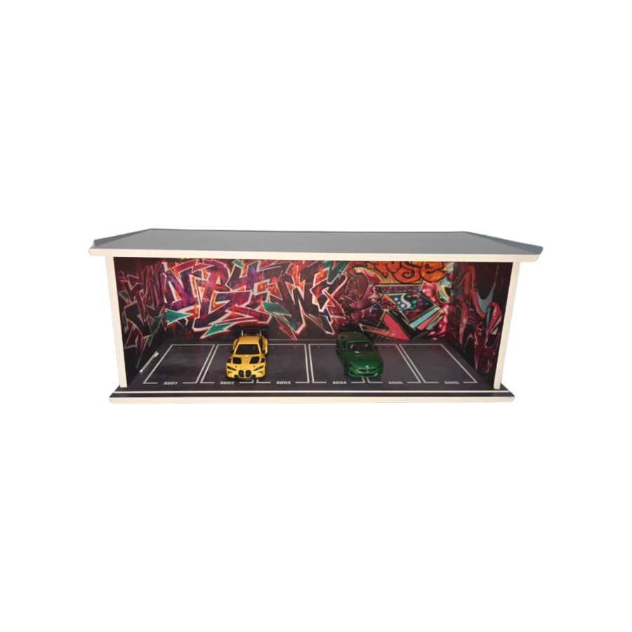 Garage workshop diorama featuring a graffiti wall backdrop designed for 1:64 scale displays and ideal for urban tuner or street racing scenes.