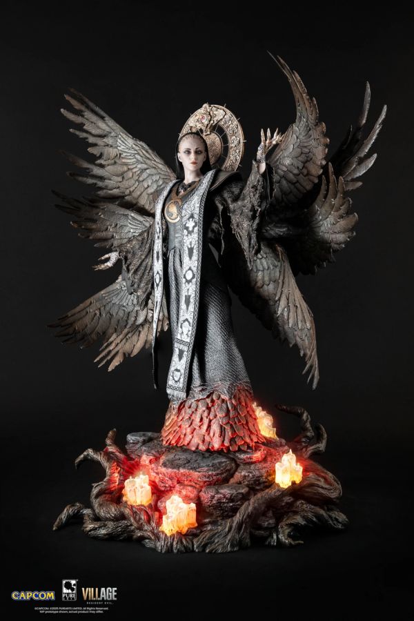 Cult leader, biologist, and superhuman villain of Resident Evil Village is captured in stunningly high detail! All six of her majestic wings are spread and her golden halo and expertly sculpted dress exude divinity. Standing gracefully atop a detailed stone floor base complete with tentacles from The Mold that infected her, Mother Miranda can be displayed with or without her golden mask.