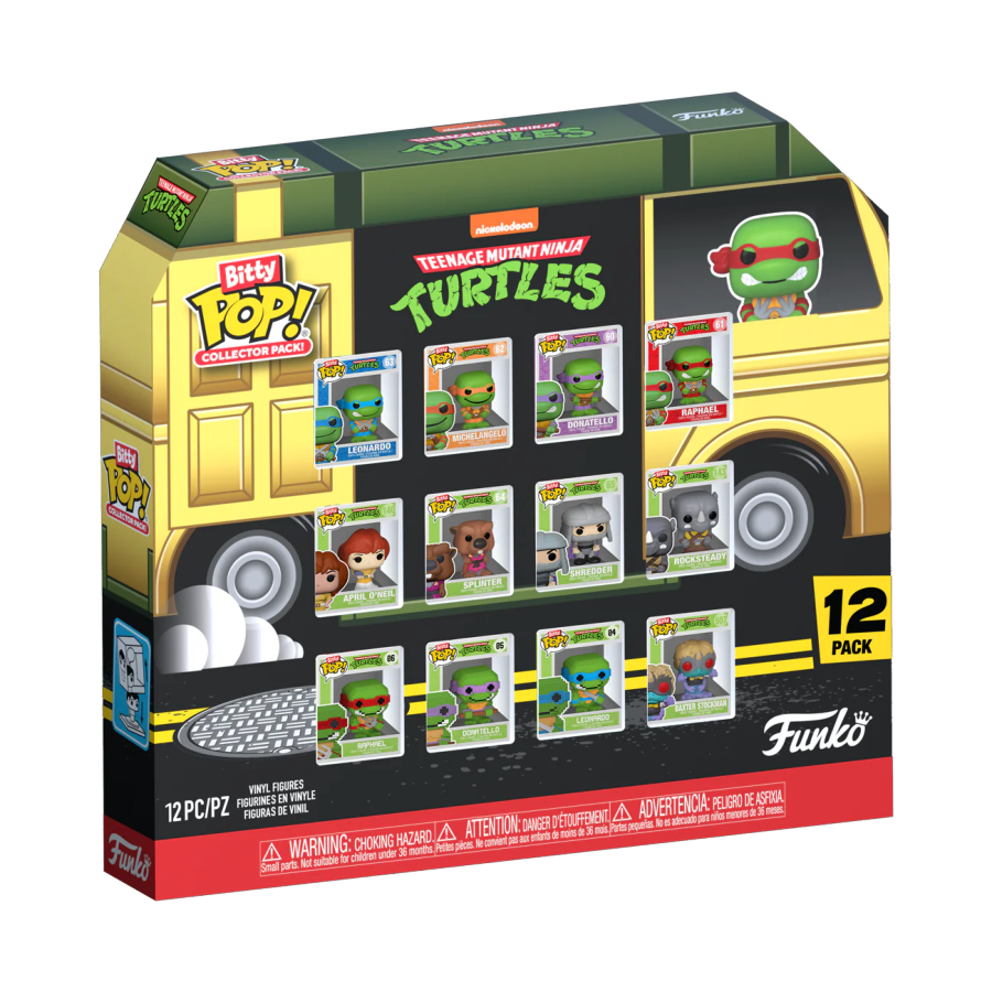 This exclusive 12-pack includes Bitty Pop! Leonardo, Bitty Pop! Michelangelo, Bitty Pop! Donatello, Bitty Pop! Raphael, Bitty Pop! April O'Neil, Bitty Pop! Splinter, Bitty Pop! Shredder, Bitty Pop! Rocksteady, Bitty Pop! 8-Bit Raphael, Bitty Pop! 8-Bit Donatello, Bitty Pop! 8-Bit Leonardo, and Bitty Pop! Baxter Stockman.