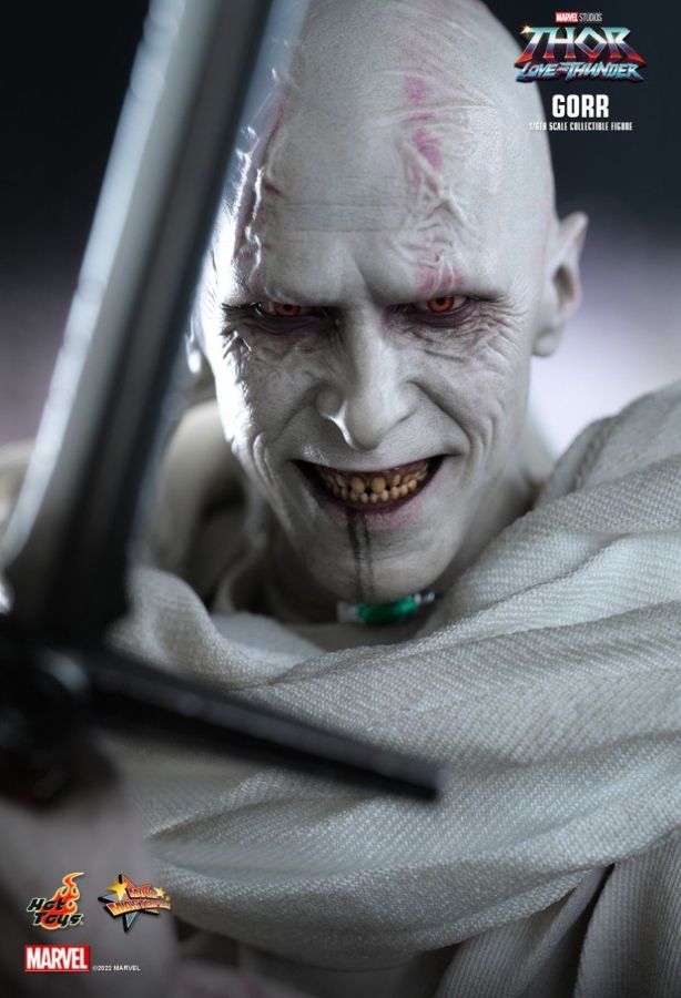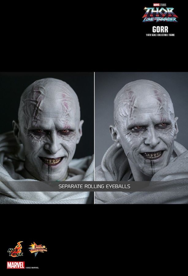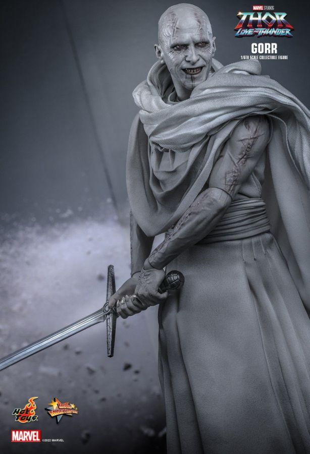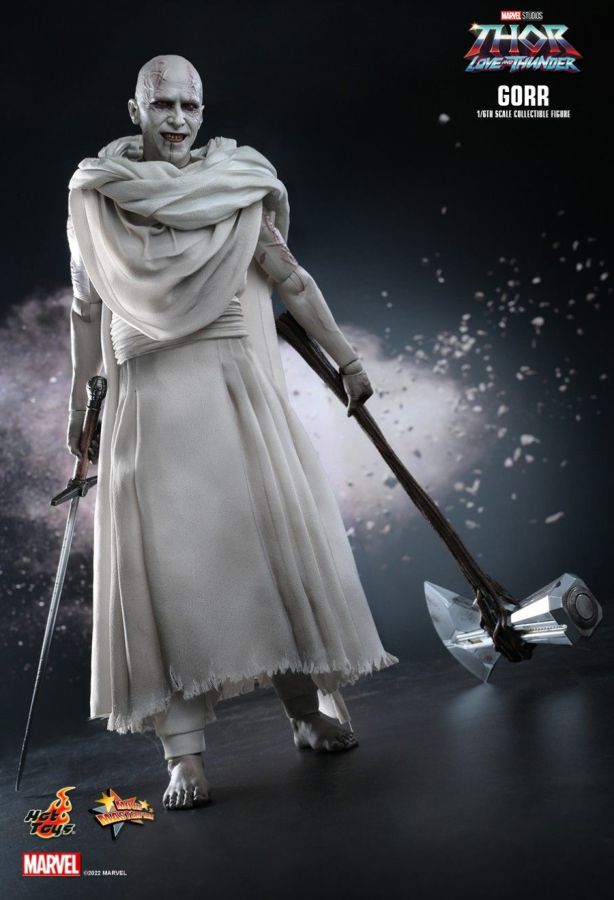 This product is expected to ship: Jan 2024 - Jun 2024 "So this is my vow. All gods will die." - Gorr A being of deadly reckoning, Gorr the God Butcher is hellbent on killing all the gods in the Universe. Wielding a powerful and terrifying weapon, Gorr will let nothing stand in his way. Hot Toys is thrilled to expand the Thor: Love and Thunder collection series with Gorr in 1/6th scale collectible figure depicting his fearsome visage from his premiere appearance in the movie. The highly-accurate collectible figure is masterfully crafted based on the appearance of Christian Bale as Gorr in Thor: Love and Thunder, featuring a newly developed head sculpt with separate rolling eyeballs function, sculpted scars and crooked teeth; a newly designed body and arms with scars; carefully-tailored fabric robe; and high attention to details. With iconic weapons and accessories include a Necrosword sword, a battle damaged Necrosword, Thor's Stormbreaker, a necklace and a figure stand. Recreate the scenes with the Gorr collectible figure now! The 1/6th scale Gorr Collectible Figure specially features: - Authentic and detailed likeness of Christian Bale as Gorr in Marvel Studios ’ Thor: Love and Thunder - One (1) newly developed head sculpt with separate rolling eyeballs - Movie-accurate facial expression with detailed skin texture, scars and make-up - Approximately 30 cm tall - Newly developed body with over 30 points of articulations - Five (5) pieces of interchangeable hands including: - One (1) pair of fists - One (1) pair of relax hands - One (1) pair of open hands - One (1) pair of gesture hands - One (1) pair for weapons holding hands - Each piece of head sculpt is specially hand-painted Costume: - One (1) greyish white-colored robe and cape with weathering effects - One (1) greyish white-colored scarf with weathering effects Weapons: - One (1) Necrosword - One (1) battle-damaged Necrosword - One (1) Stormbreaker with LED light-up function (batteries required) Accessories: - One (1) necklace - A themed figure stand with movie logo and character name