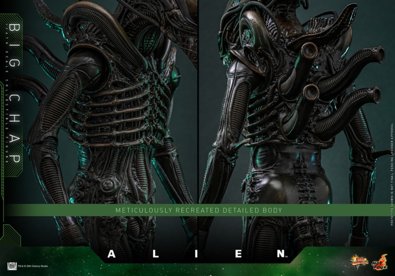 The impressive Big Chap sixth-scale collectible figure stands at approximately 36 cm tall and is expertly painted and sculpted to capture the organic appearance of a Xenomorph. It features a newly developed head sculpt with intricate internal structures visible beneath a translucent carapace, along with an articulated jaw. The newly designed extendable inner jaw allows collectors to create dynamic facial expressions. The newly developed silicone material body is meticulously painted and sculpted to showcase its fine textures, complete with a bendable tail and eight pairs of interchangeable hands, including one pair with bendable fingers, enabling collectors to create dynamic poses. Additionally, it comes with a Xenomorph remains-themed diorama base for an immersive display.