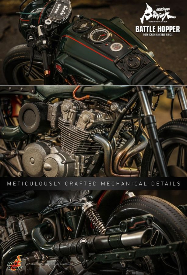 Riding a Battle Hopper, thus raising a cloud of dust, Kamen Rider BLACK SUN crosses the city in his remarkable look carrying his inevitable destiny. Kamen Rider Black Sun is a remake of the highly popular “Kamen Rider Black ” series in commemoration of the 50th anniversary of Kamen Rider's creation. The series returns to its roots with a sorrowful following a protagonist who shoulders a cruel destiny. The one-sixth scale Battle Hopper Collectible Vehicle faithfully recreated the vehicle as seen in Kamen Rider Black Sun series by precision details and fine painting applications. Measures 37.5cm in length, features LED light up function design on head, body and tail lights, adjustable-degree handlebar, spring suspension, rotatable wheels given a realistic tread pattern, also highly-accurate mechanical details showcased on the engine, frame, exhaust, and side stands, comes with a specialized display base. The 1/6th scale Battle Hopper Collectible Vehicle specially features: - Authentically and detailed likeness of Battle Hopper in Kamen Rider BLACK SUN - Depicts Battle Hooper specific features such as the engine, frame, exhaust, and side stands - Approximately 37cm L x 14cm W x 20cm H (include antenna) - LED light up function design on body, headlight and rear signal light (power operated) - Adjustable-degree handlebar for making left/right turns - Working spring suspension - Rotatable wheels are given a realistic tread pattern - One (1) specially designed collectible vehicle display base - Sized to fit with Kamen Rider Black Sun 1/6th scale Collectible Figure View all