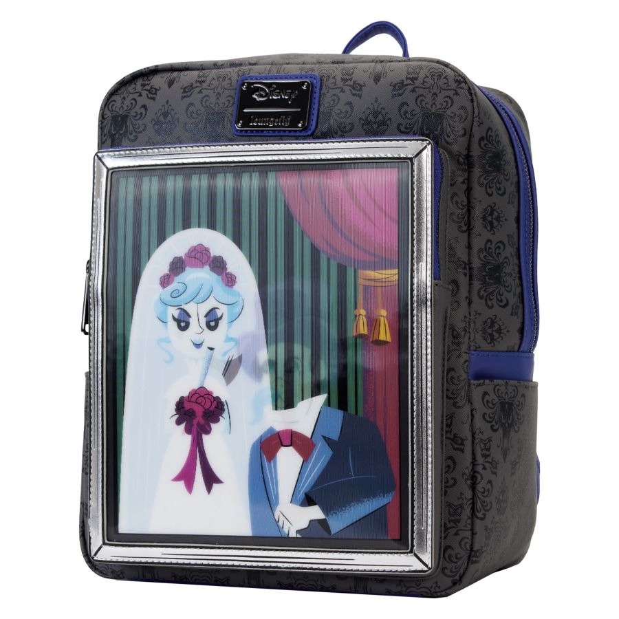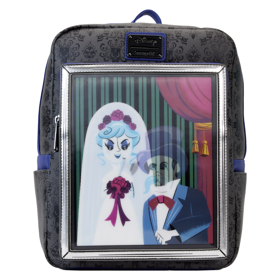 Til death do us part! The Loungefly Haunted Mansion Black Widow Bride Lenticular Mini Backpack paints a portrait of marital bliss or does it? On the front zipper pocket, a framed photograph shows a bride and her groom. Tilt the bag back and forth to get a menacing look at the full picture. Up above, the iconic Haunted Mansion wallpaper design covers the rest of the bag while a gargoyle appears on the back. Whether you hear wedding bells in your future or are waiting to catch the brides bouquet, this mini backpack is a fun tribute for theme park lovers everywhere.