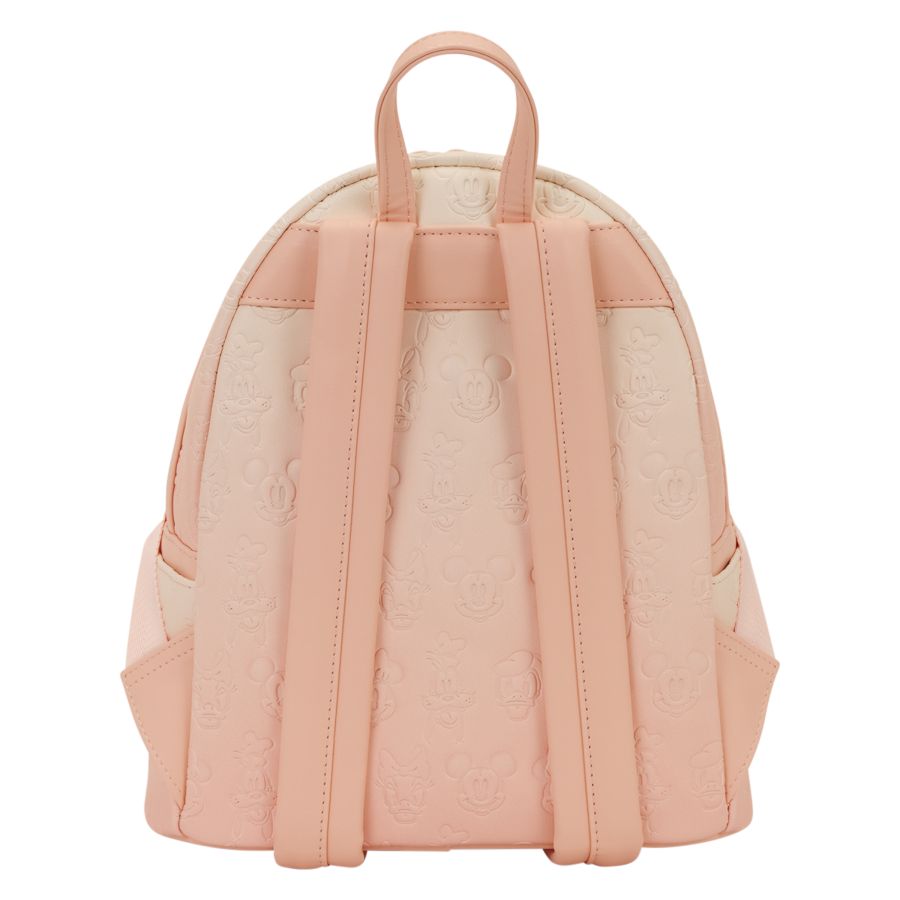 This mini backpack features a pink ombre design with debossed details of Mickey Mouse and all his friends! You'll find a painted molded metal rivet of Mickey Mouse on the front pocket, which also features a flap with a super cute scalloped edge. Pink straps bring the whole look together!