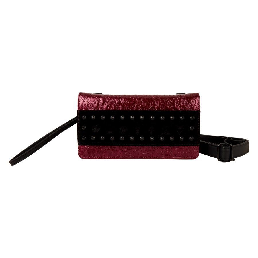 Find debossed symbols of popular Disney Villains within spiky thorns all over the bag. Stud cones and velvet bring the whole look together. This style is versatile: you can carry it as a clutch by using the wristlet strap or attach the crossbody strap to wear it like a purse!